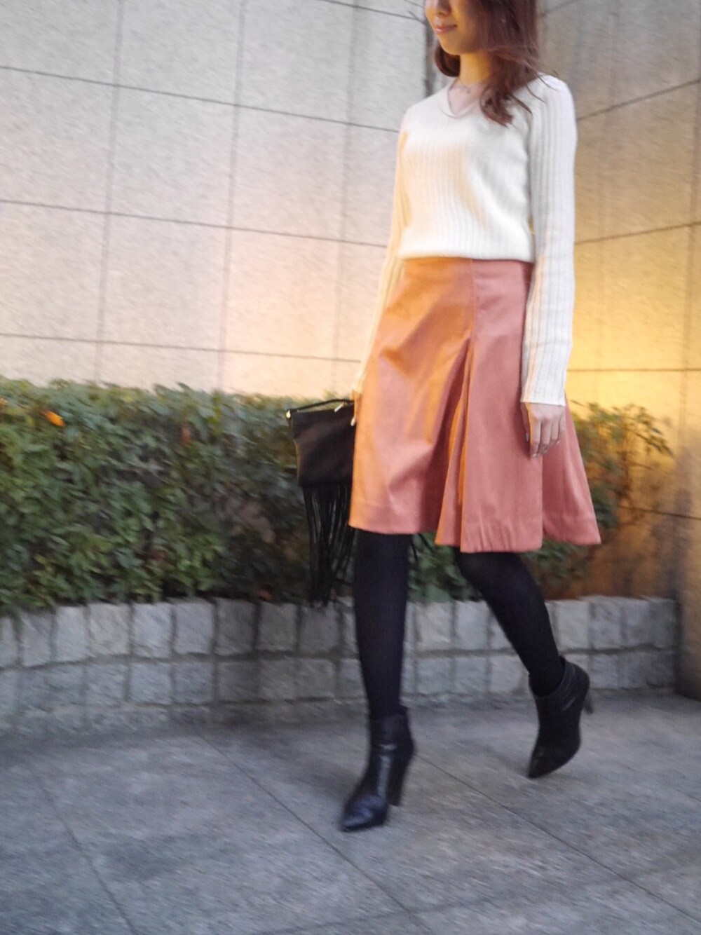 ホワイト×ピンクでフェミニンカラーのコーデ♡ 他の小物はブラックで統一してまとまりを出しました。 こちらのニットとスカートはどちらもセール中! 大変お求めやすい価格となっております✨