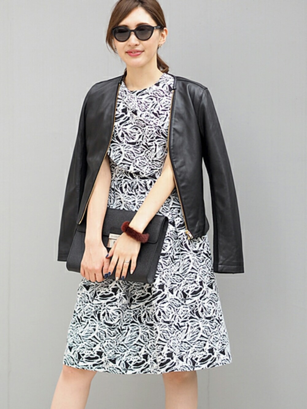 立体感のあるフラワー柄のジャガード素材を贅沢に用いたドレス。 トップス部分にタックドレープをとって立体感が出るよう細部にもこだわりました。