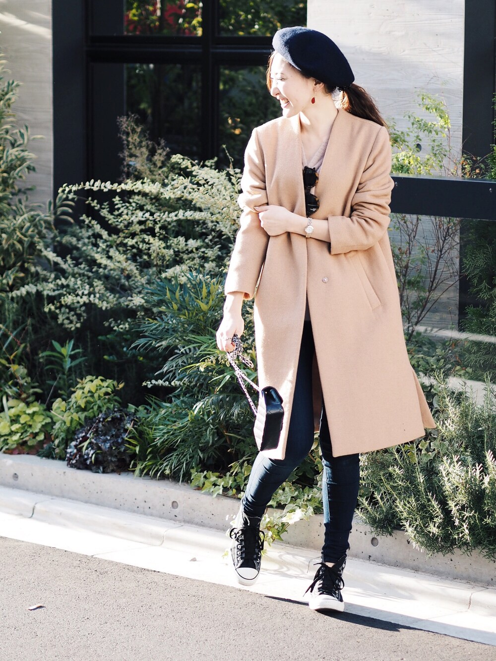ノーカラーの綺麗めコートを休日はスニーカーやベレーを合わせてカジュアルに♡