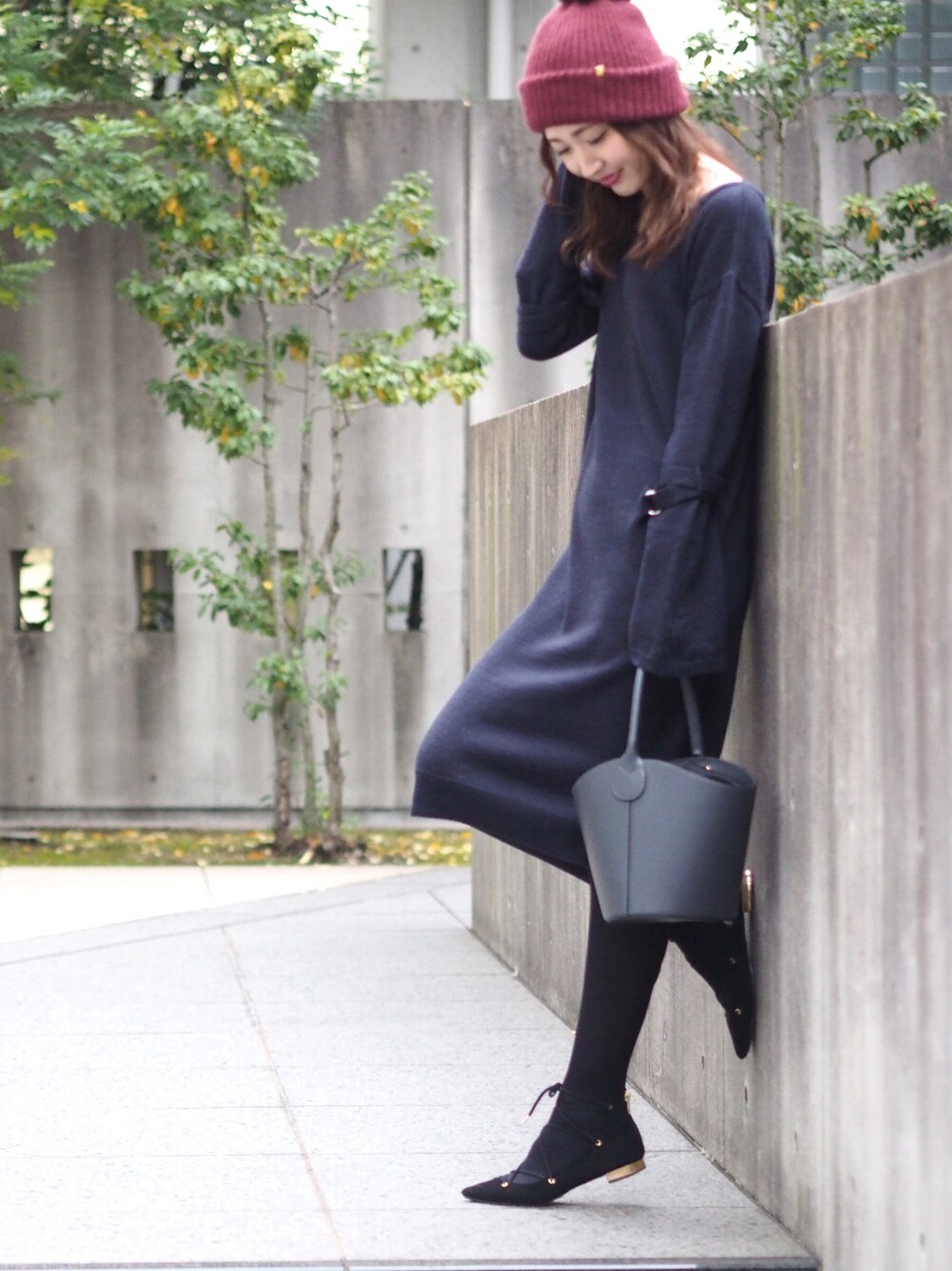 外をよく歩く寒い日は、長め丈のニットワンピがあったかくて便利です♡