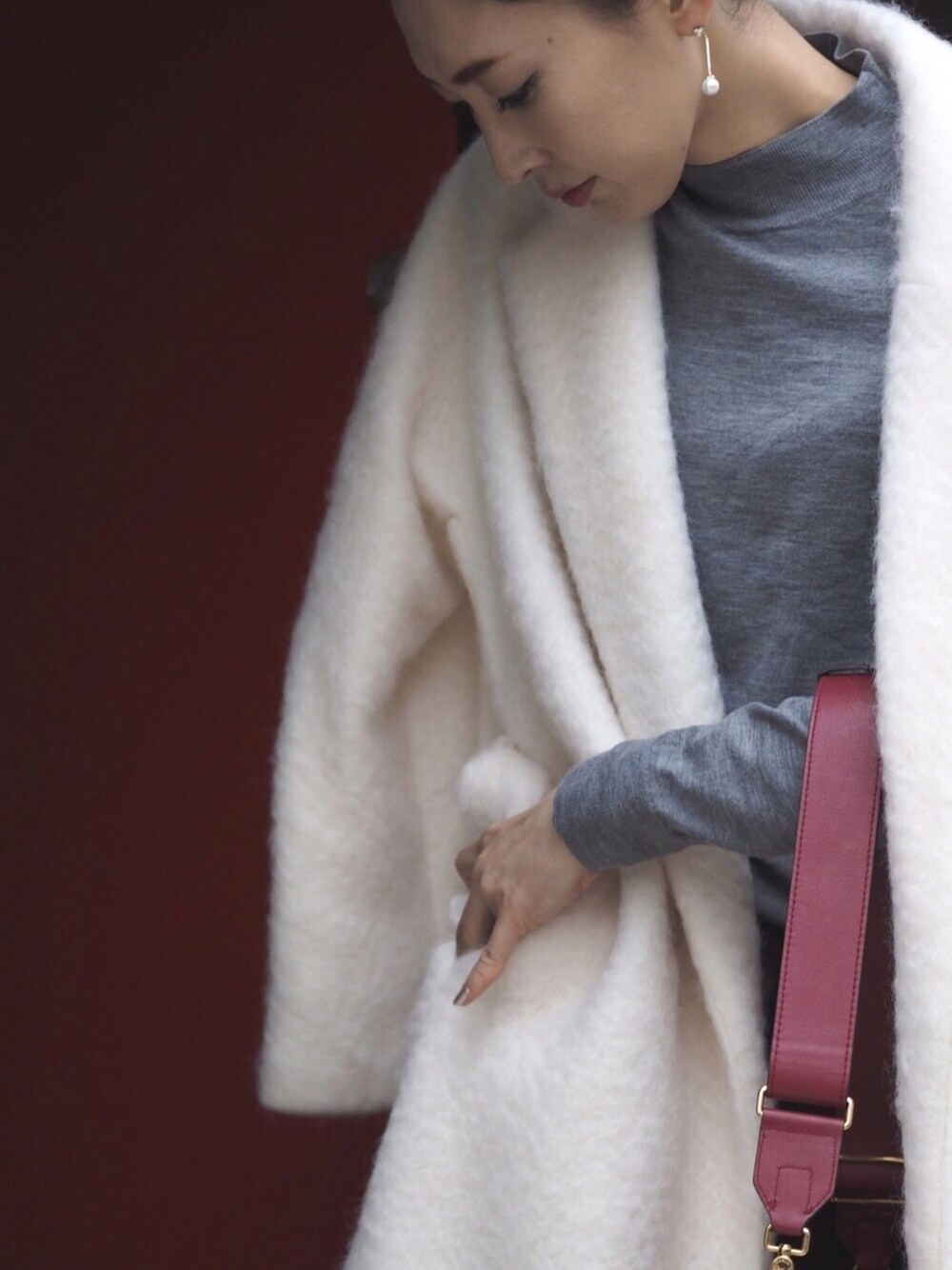 白のふわふわのコートは、見た目もあたたかで可愛いです💕
