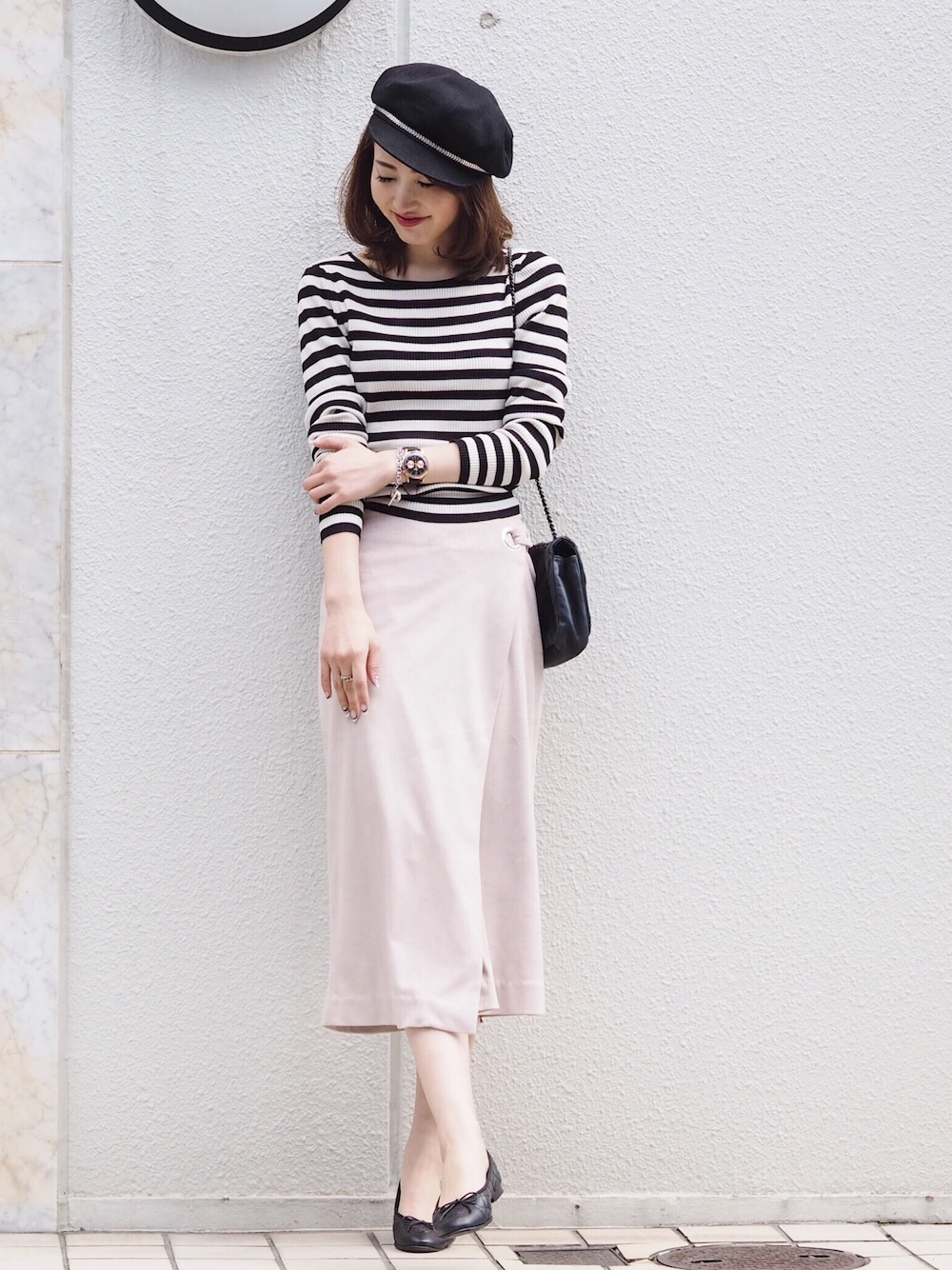 フェミニンそうに見えるスカートも、ボーダーや小物で、カジュアルに♡