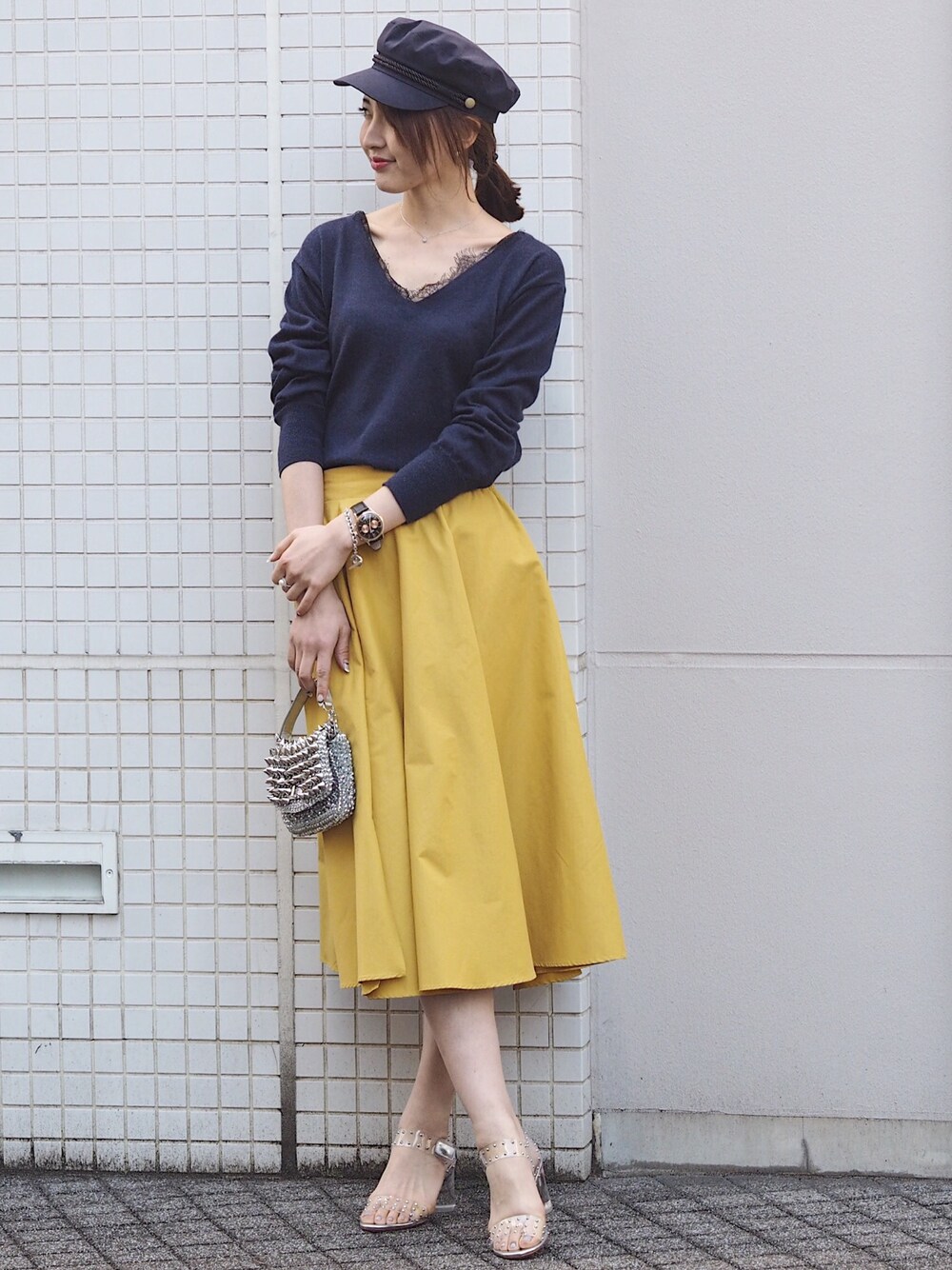 マスタード色のスカートを主役にネイビーのレースニットで女性らしさをプラスしてみました♪