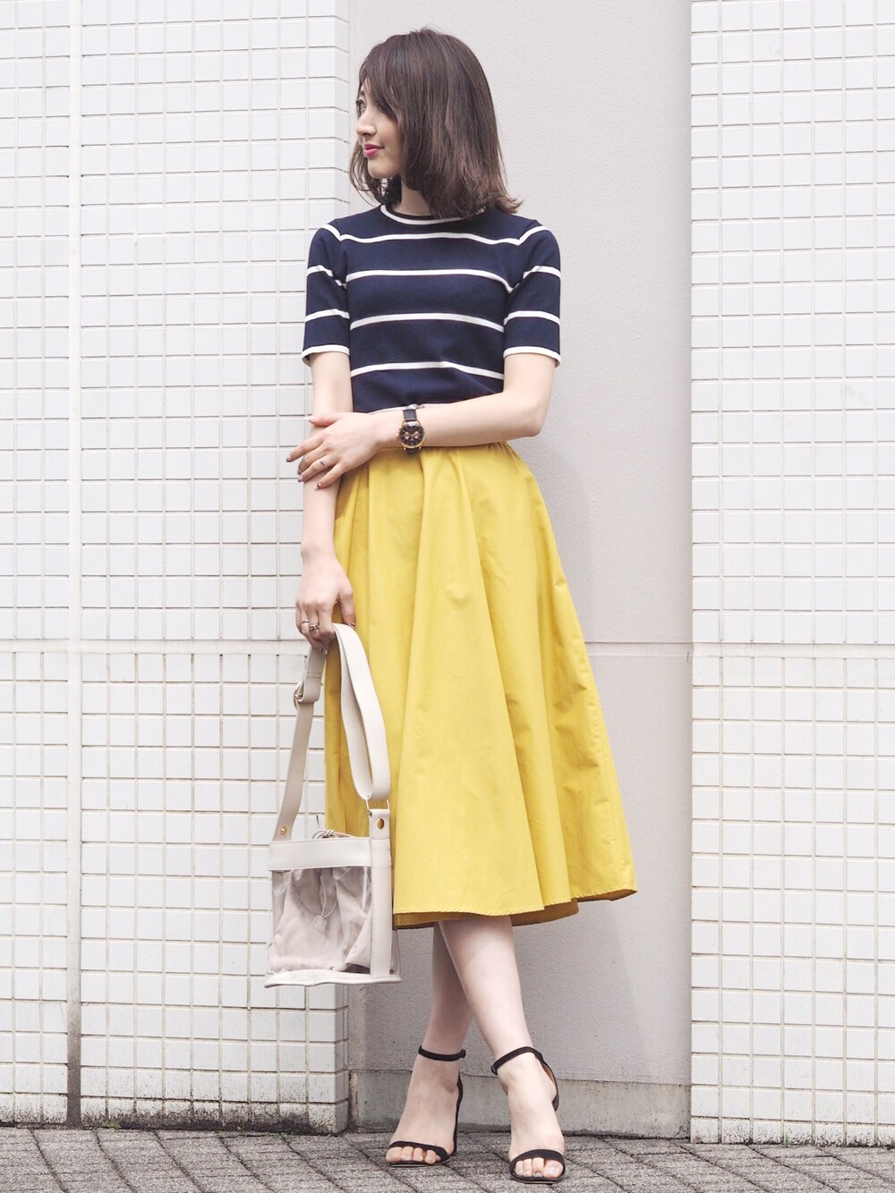 マスタードカラーのスカートは、マリンアイテムと合わせてみました♡
