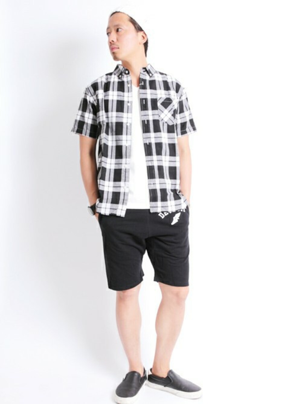 全身をブラックとホワイトでまとめたコーディネート。 季節感のある半袖チェックシャツに、 カレッジロゴのプリントは映えるスウェットショーツを合わせました。 重たくなりすぎないようニット帽もホワイトで今年っぽいスタイルに!! H176 着用サイズ:MEDIUM