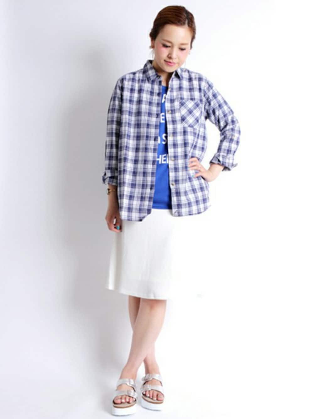 白のスカートを基調とした夏のカジュアルスタイルです。 様々なコーディネートにお使い頂ける白のスカートに、 プリントTEEとチャックシャツで可愛らしくカジュアルに仕上がりました!! H164 着用サイズ:FREE