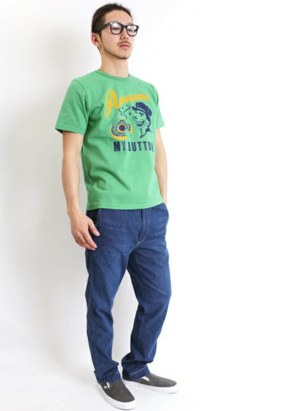 Denimeオリジナルの丈夫で肉厚な生地感で、 定評のあるベーシックカット生地を使用したボディにプリント施したプリントTEE。 某レコード会社のロゴをモチーフにしたロゴがポイントです。 ボトムスはJELT DENIMで仕立てたトラウザーズのユーズド加工モデル。 インパクトのあるプリントTEEをベースにした夏のゆるカジスタイルです!! H175 着用サイズ:MEDIUM