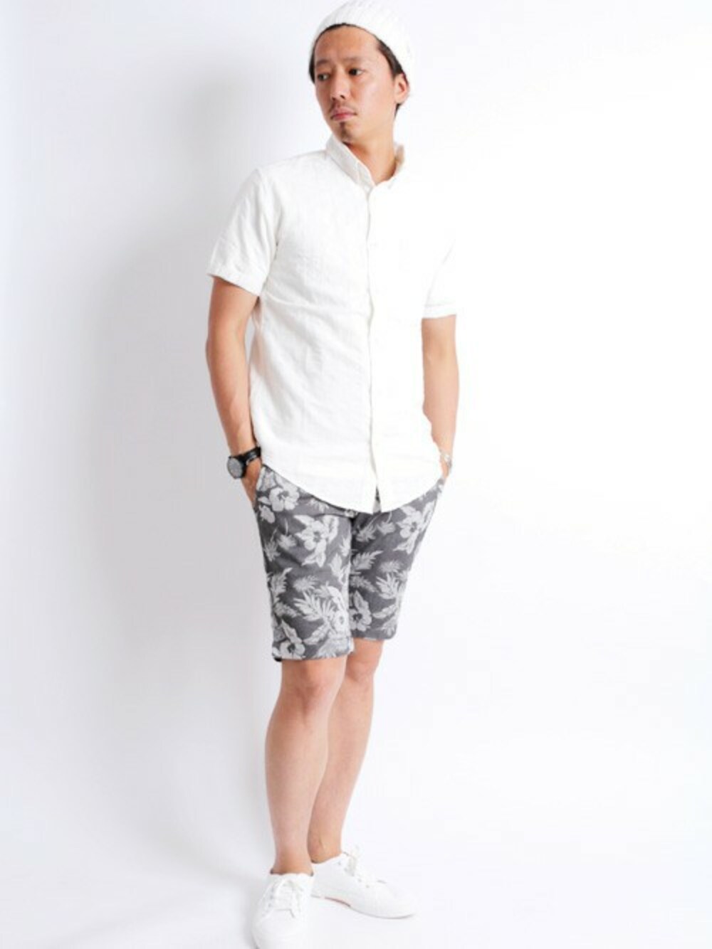 ジャガード織りで表現したアロハ柄がポイントのショーツをベースとしたスタイリング。 ショーツ以外を白でまとめ統一感を出しました。 ショーツで緩くなりすぎないようトップスにシャツを持ってきたのもポイントです!! H176 着用サイズ:MEDIUM