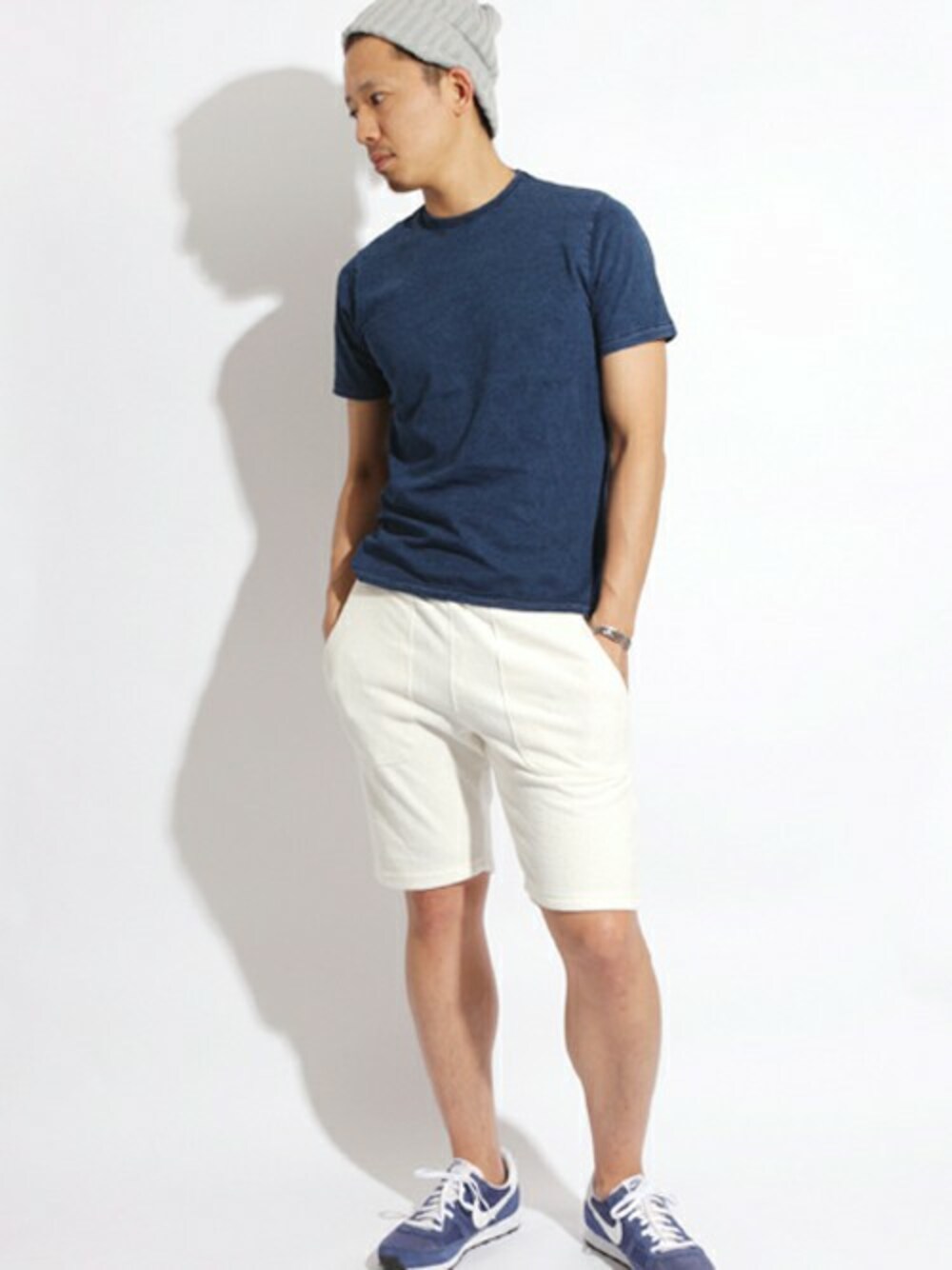 WEB限定のインディゴクルーネックTシャツをベースにしたシンプルなカジュアルスタイル。 履き心地の良いパイル生地のショートパンツもオススメです!! シンプルなコーディネートを素材感やカラーで差を付けたスタイリングです!! H175 着用サイズ:MEDIUM