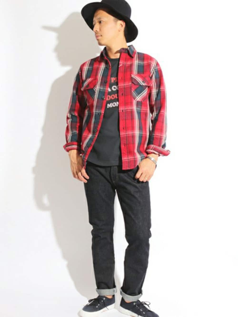 秋冬の予約商品となるチェックネルをベースとしたスタイリング。 インナーのプリントTも色を合わせたネイビー×レッドコーデ。 ネルシャツを際立たせたカジュアルコーデです!! H176 着用サイズ:MEDIUM