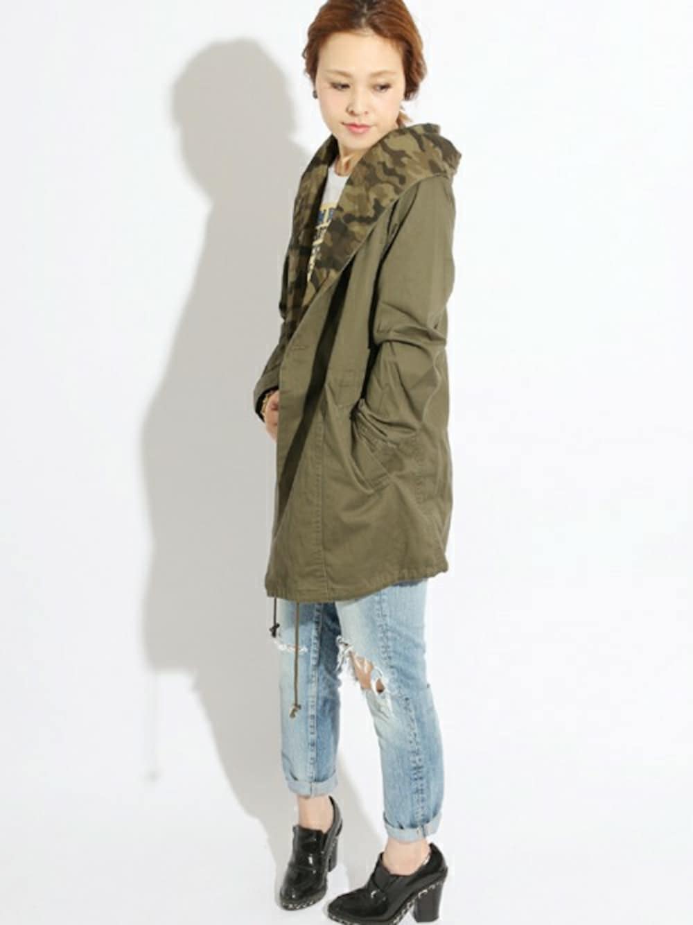 秋冬新作のモッズコートをベースにしたミリタリーコーデ。 ミリタリー色の強いモッズコートをクラッシュデニムでカジュアルダウンしました。 ヒールを合わせ野暮ったくなく女性らしい秋コーデが完成しました!!