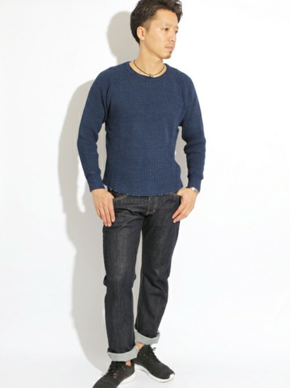 2015AWのインディゴヘビーサーマルと新作のデニムパンツを合わせたネイビーコーデ。 全身をネイビーでシンプルにスタイリング。 それぞれのアイテムの素材感がポイントです!!