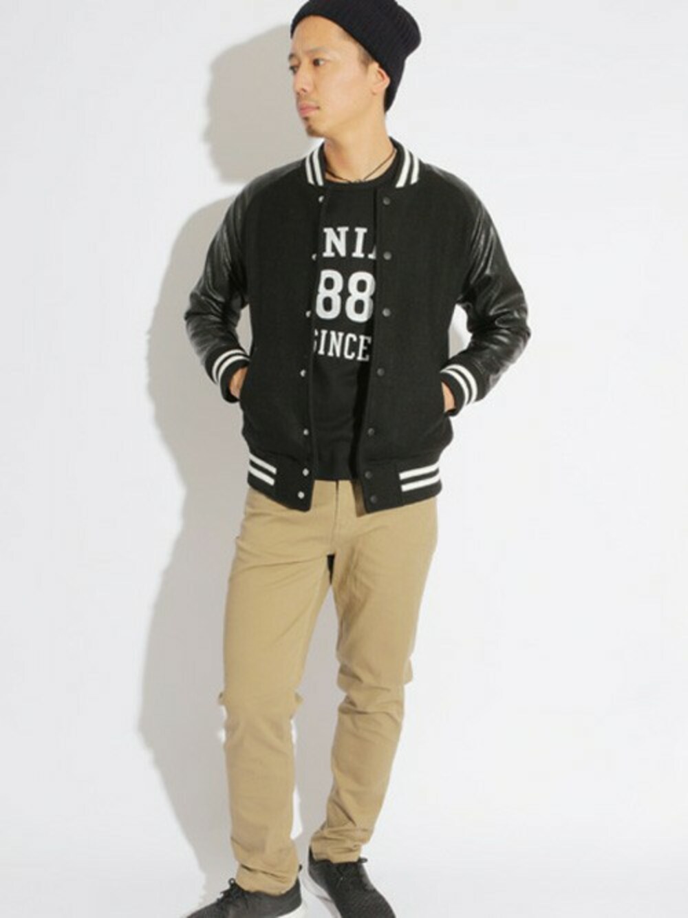 秋冬予約のメルトンスタジャンをベースとしたカジュアルコーデ。 ストレッチのツイルパンツをベージュで合わせそれ以外をオールブラックで統一。 重たくならないようインナーのカットソーはプリントをON!! 王道のアメカジスタイリングを現代的なサイズ感で表現しました!!