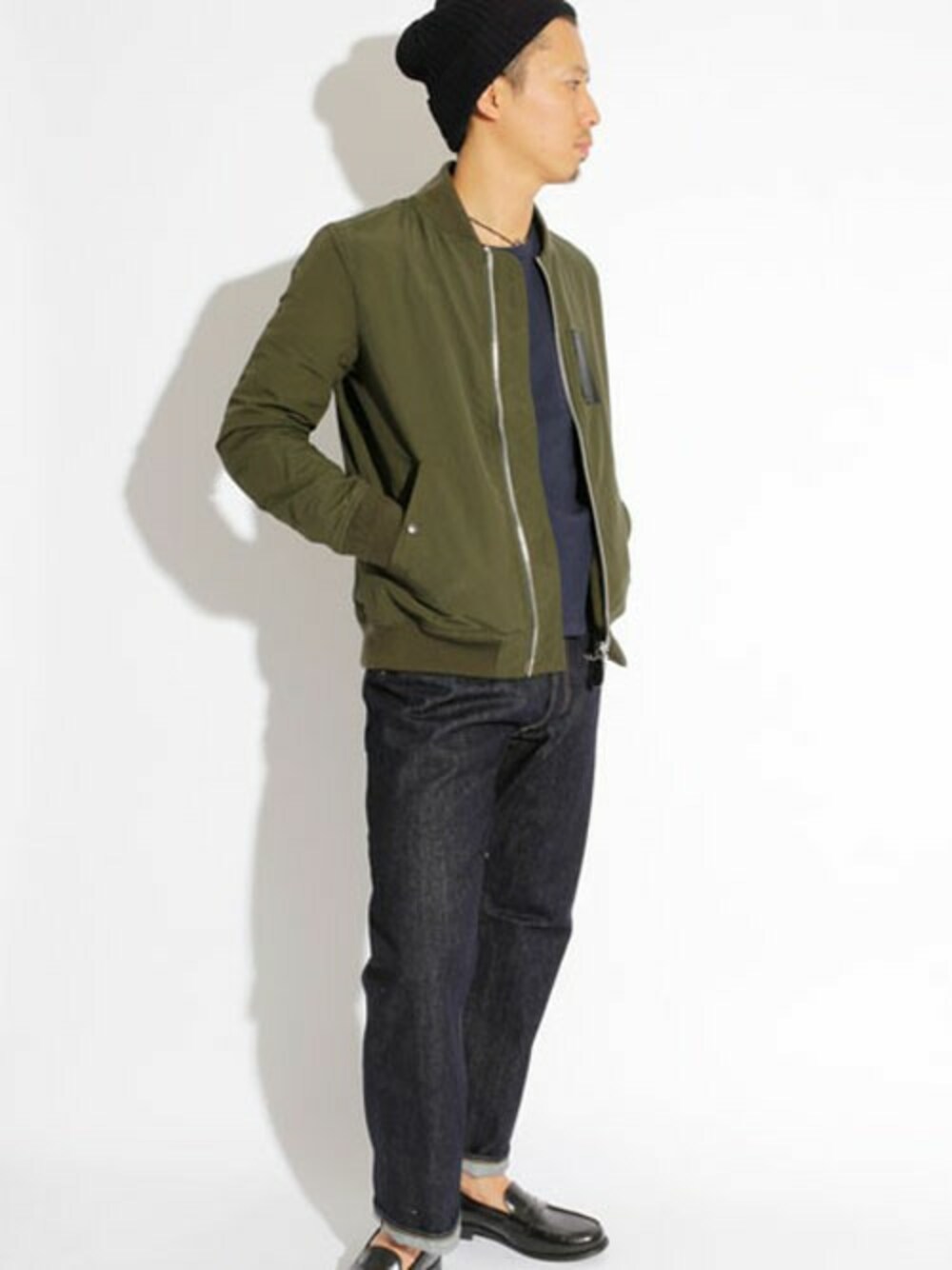 秋冬新作のMA-1をベースとしたアメカジコーディネート。 ベースはアメカジの定番スタイリングですが、 あえてやや太めのデニムパンツにローファーを合わせ、 他とは違う大人なカジュアルコーデです!!