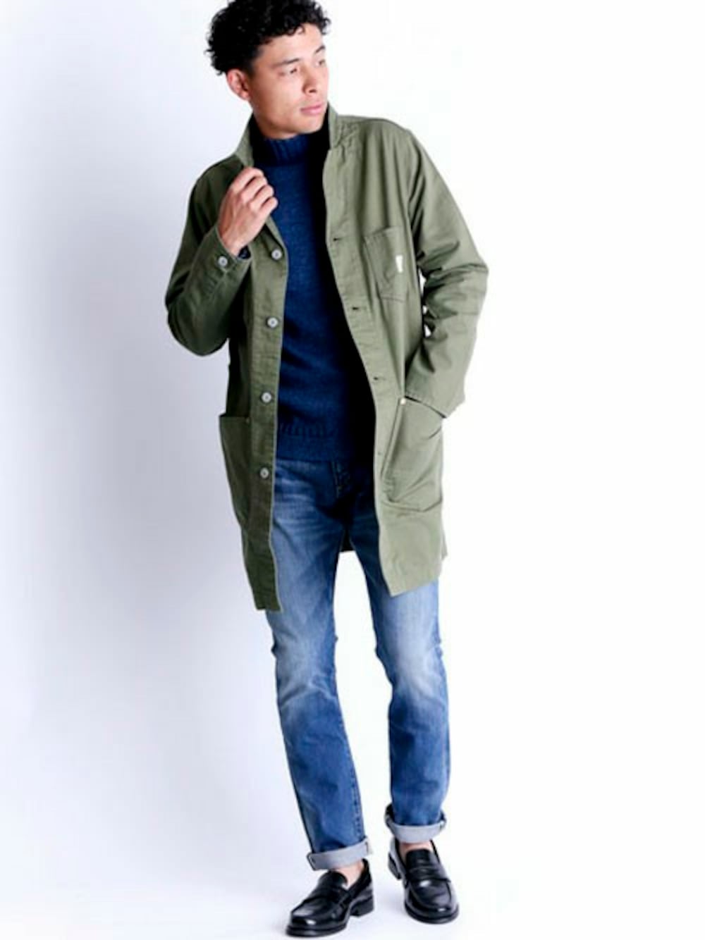 15AW新作のショップコートをベースとしたカジュアルコーデ。 今季注目カラーのカーキが特徴の1枚。