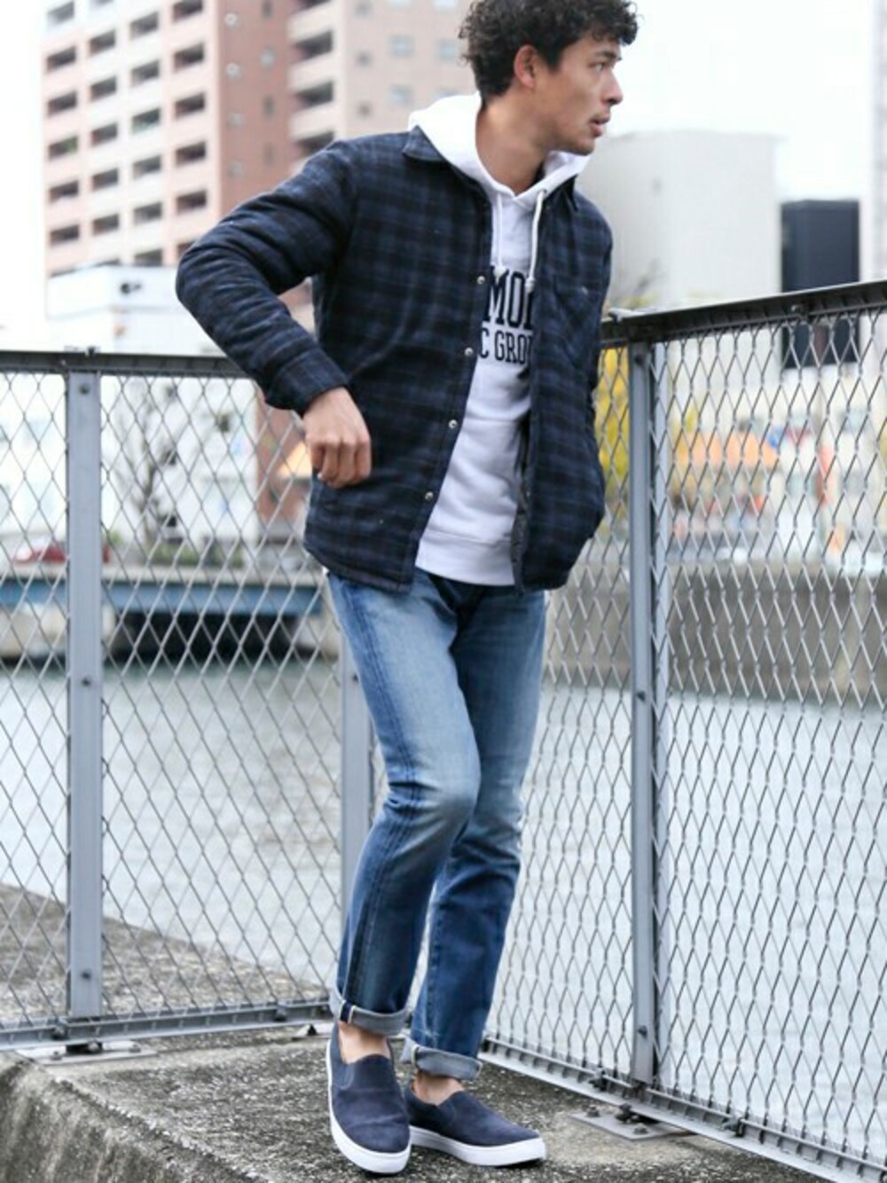 チェックのCPOシャツジャケットはコーチジャケット感覚でスタイリング! インナー使いのパーカーが良い感じにカジュアル感を出してくれてます。 ロールアップの細めで大人の雰囲気がポイントです。