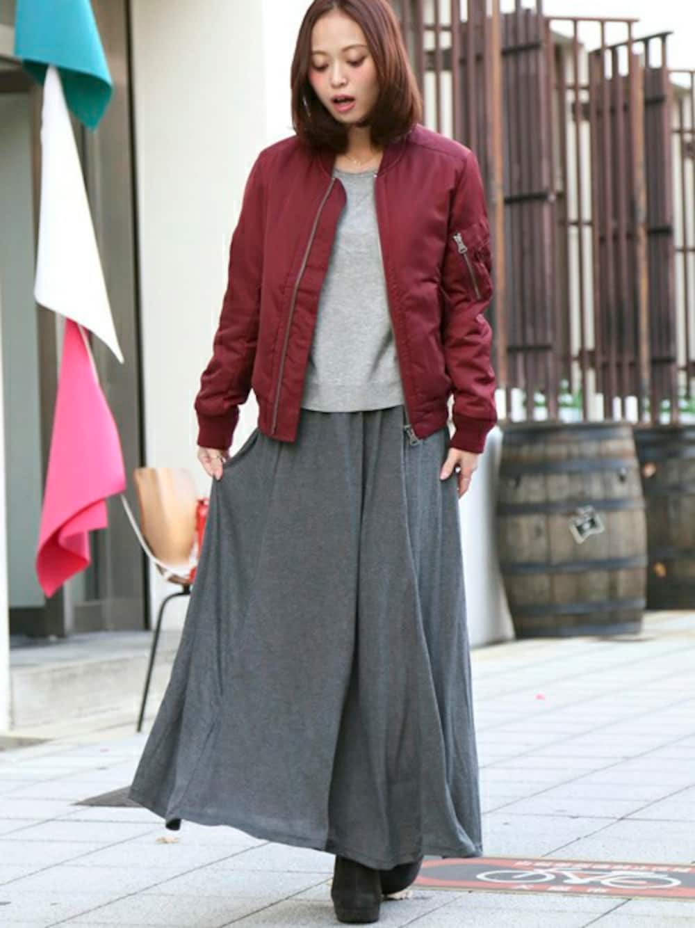 トレンドアイテムのMA-1をベースにマキシ丈のスカートでスタイリング! 定番アイテムな分色目で遊べて女性らしさも大事にできるワインレッドはシンプルな一枚でアクセントを付けれます。 その分他のアイテムをシンプルにあわして頂く事でより上品な印象で合わせれます!