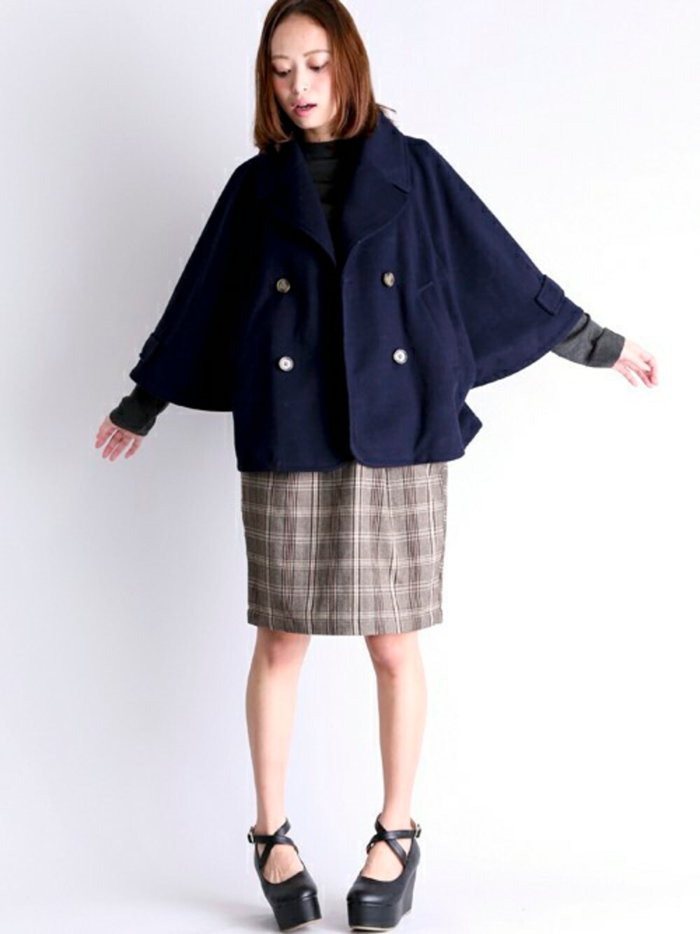 ポンチョ型コートはゆるコーデに最適なアイテムです。 チェック柄のスカートとハイネックニットを合わせて可愛さを足すのも良いかと思います。 アイテム自体の色目を落ち着いたネイビーやブラウンを使う事で、大人の雰囲気も出せるかと思います。 可愛く、綺麗なコーディネートの一つですね!