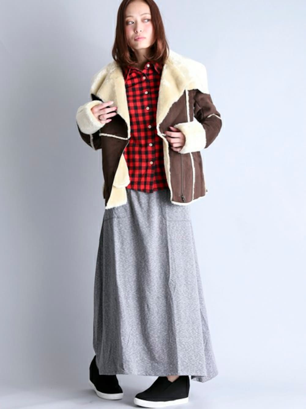 今期、徐々に雑誌などで紹介され始めた、ムートンジャケットはシャツと、マキシ丈スカートであわしたいです。 ネル系のシャツをインナーで合わせる事で、アメカジ感も出せますがマキシ丈スカートで女性らしさをだしています。 トップスに柄物を持ってくると派手に感じるかもしれませんが、少し柄物を加えると色目も映えるのでアクセントとしてぜひ使ってほしいですね!!