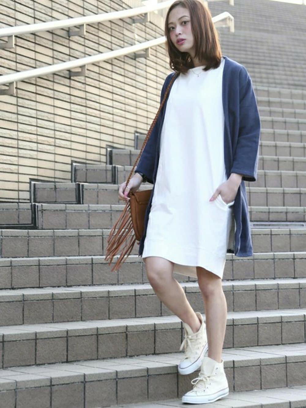 INDIGOLIKE CARDIGAN/インディゴライクスウェットカーディガン ネイビー/FREE テンジクカットソーワンピース オフホワイト/FREE フリンジポーチショルダー キャメル/FREE H162cm