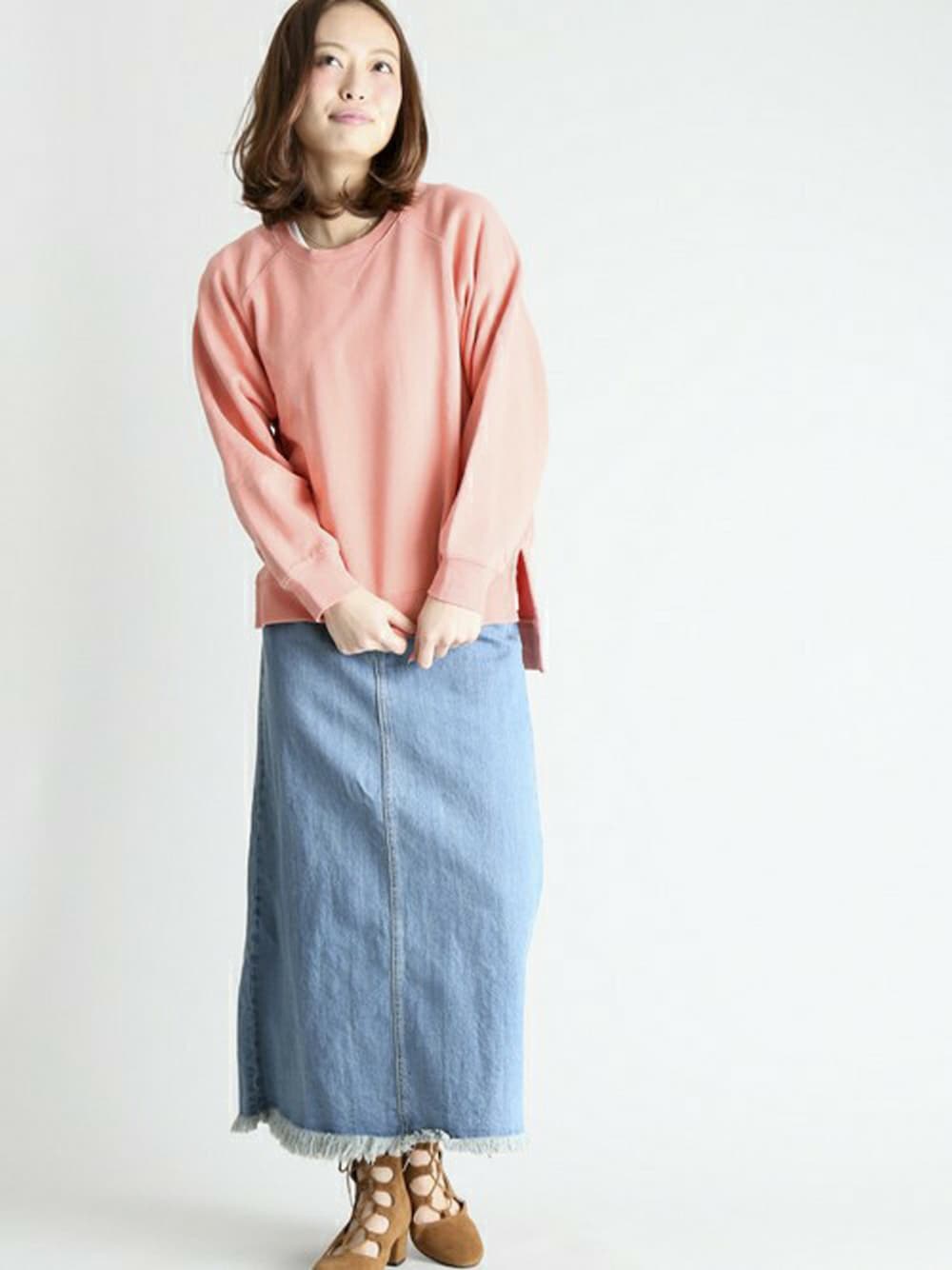ベーシックムジスウェット・オレンジ/FREE デニムマキシスカート・ライトインディゴブルー/X-SMALL H162cm