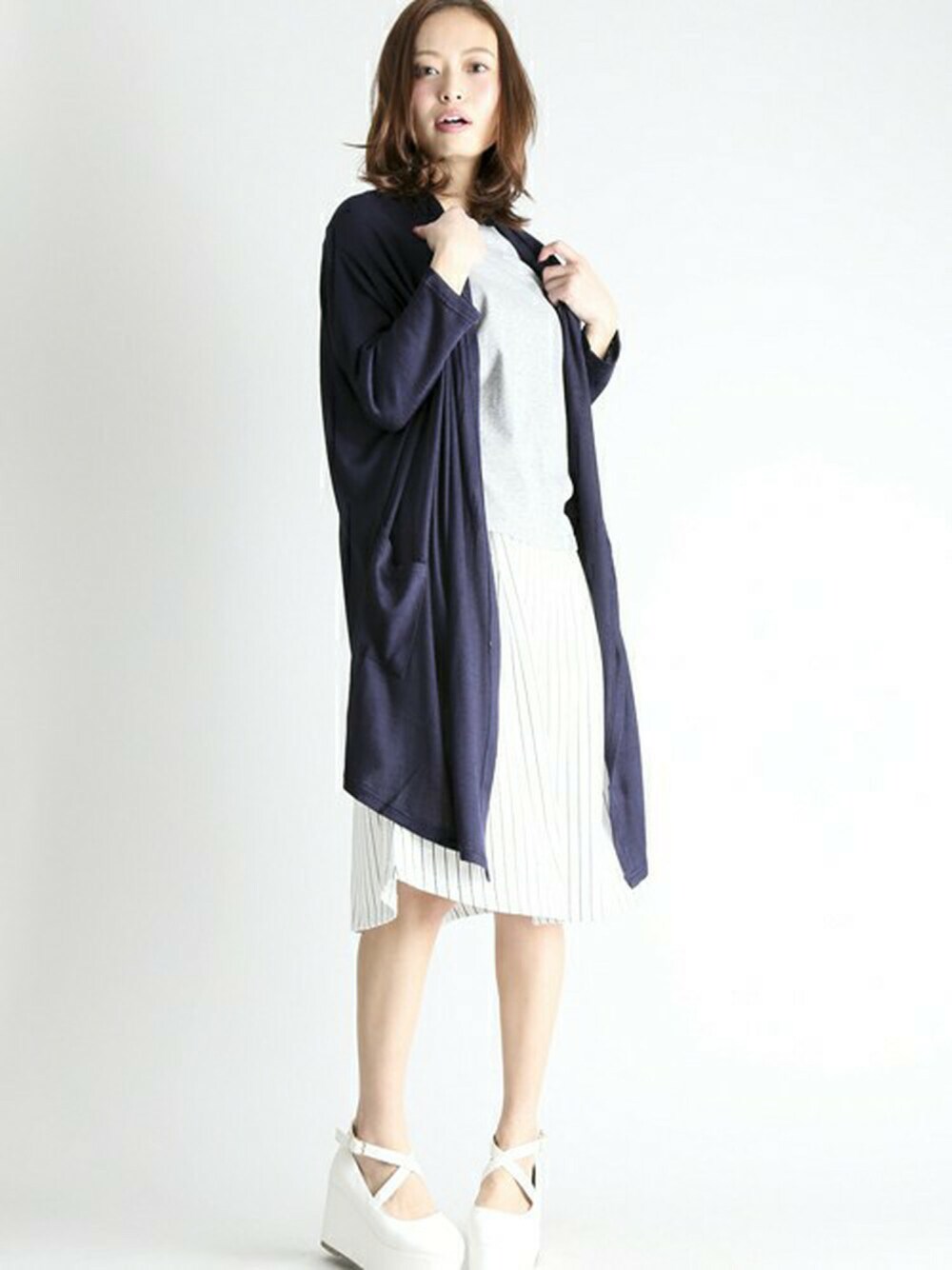 ニットソーフードカーディガン・ネイビー/FREE BASIC SS TEE/ベーシックショートスリーブTEE・杢グレー/FREE ストライプポンチタックスカート・ホワイト/FREE H162cm