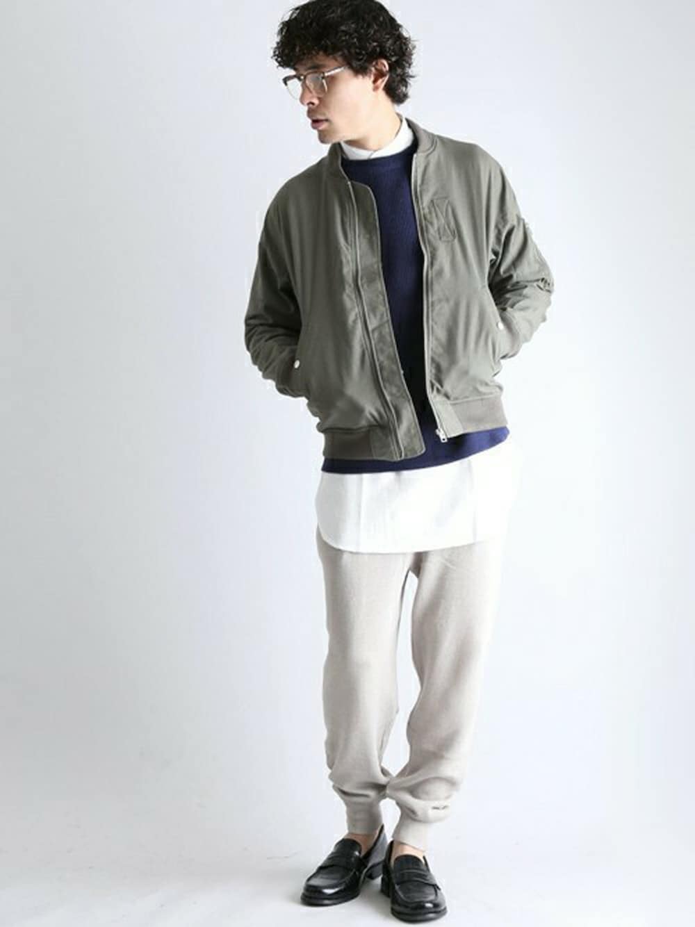 コットンリネン MA1・カーキ/MEDIUM CL Pull Over KNIT/コットンリネンプルオーバーニット・ネイビー/MEDIUM ワッフルプルオーバーシャツ・ホワイト/MEDIUM CL RIB KNIT PANTS/コットンリネンリブニットパンツ・ベージュ/MEDIUM H173 W73 58kg 着用サイズ:MEDIUM