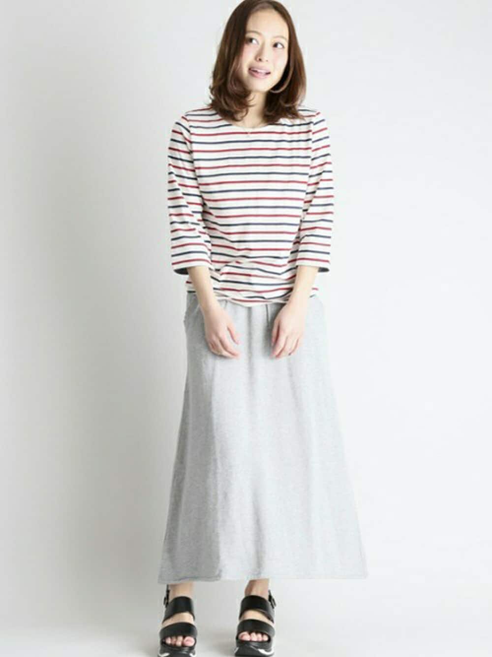 ボーダー七分袖ボートネックカットソー・トリコロール/FREE スウェットマキシスカート・杢グレー/FREE 162cm