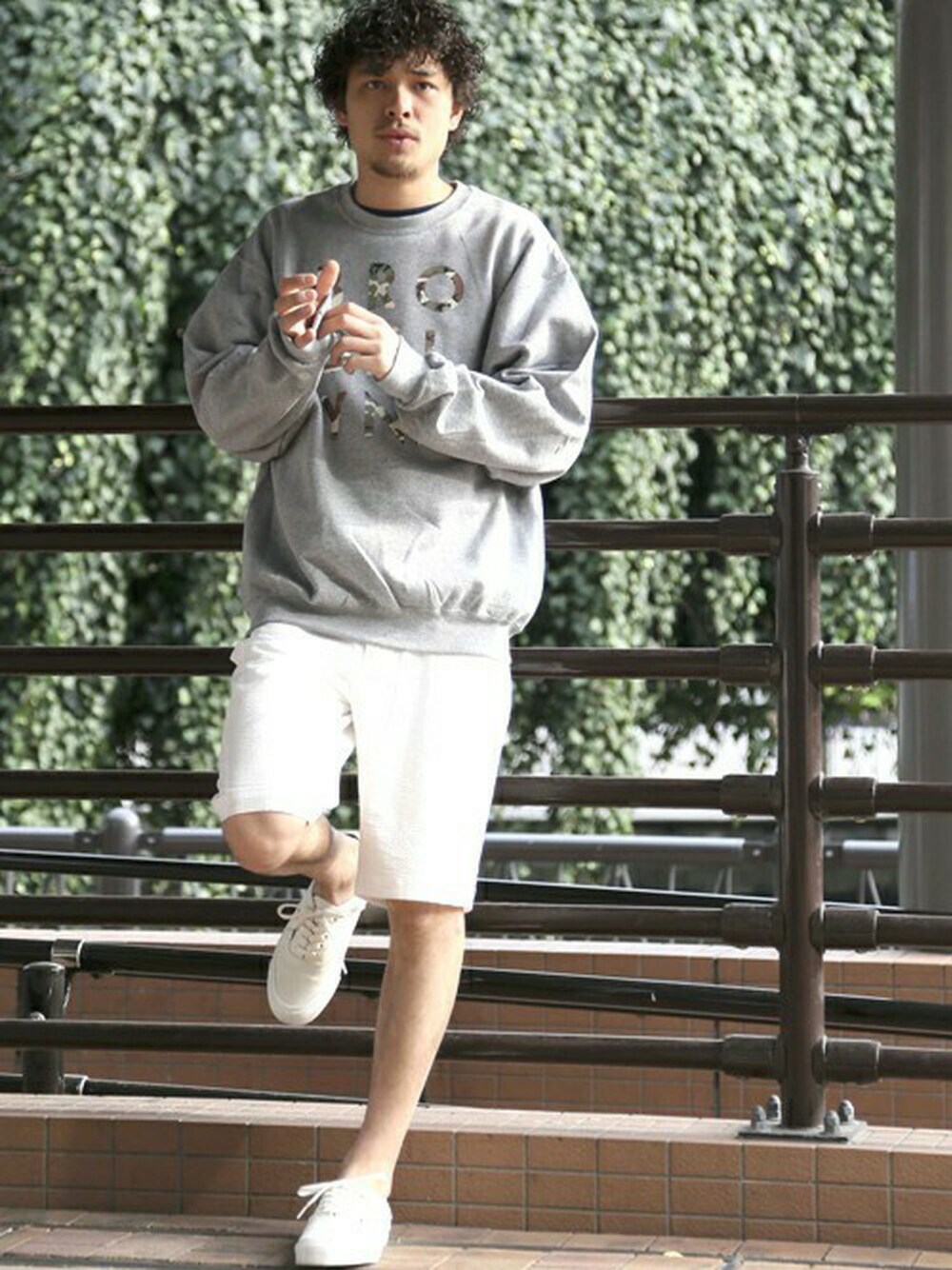 PRINTCREW SWEAT/プリントクルーネックスウェット/グレー/MEDIUM シアサッカーショーツ/ホワイト/MEDIUM 【VANS/VAULT】OG AUTHENTIC LX/ホワイト/9 H173 W73 58kg 着用サイズ:MEDIUM