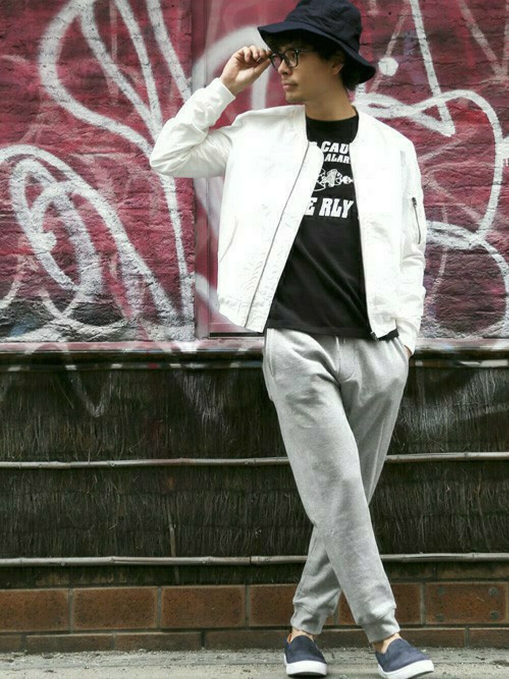 【Nine Tailor/ナインテーラー】ハット/Fuga hat・ダークインディゴブルー/FREE COTTON NYLON MA-1/コットンナイロンMA-1・ホワイト/MEDIUM 【FRUIT OF THE LOOM】プリントクルーネックT-One RLY?-・ブラック/MEDIUM(4/23トピックス掲載商品) ヘビースウェットジョガーパンツ・グレー/MEDIUM(4/22トピックス掲載商品) H173 W73 58kg