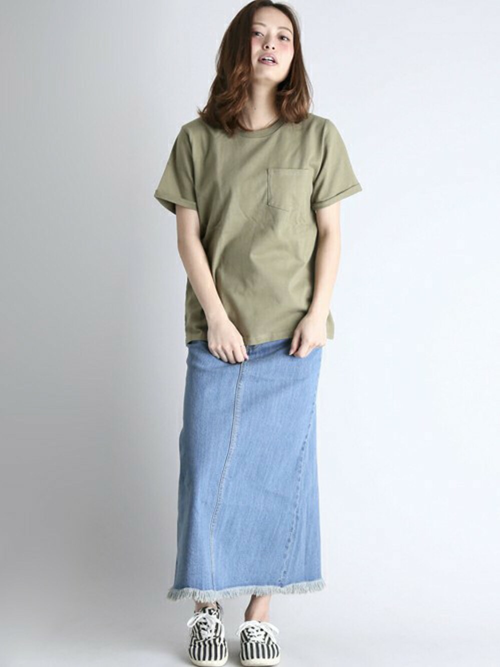 ロールアップショートスリーブTEE・ライトインディゴブルー/X-SMALL(4/28トピックス掲載商品) デニムマキシスカート・カーキ/FREE H162cm
