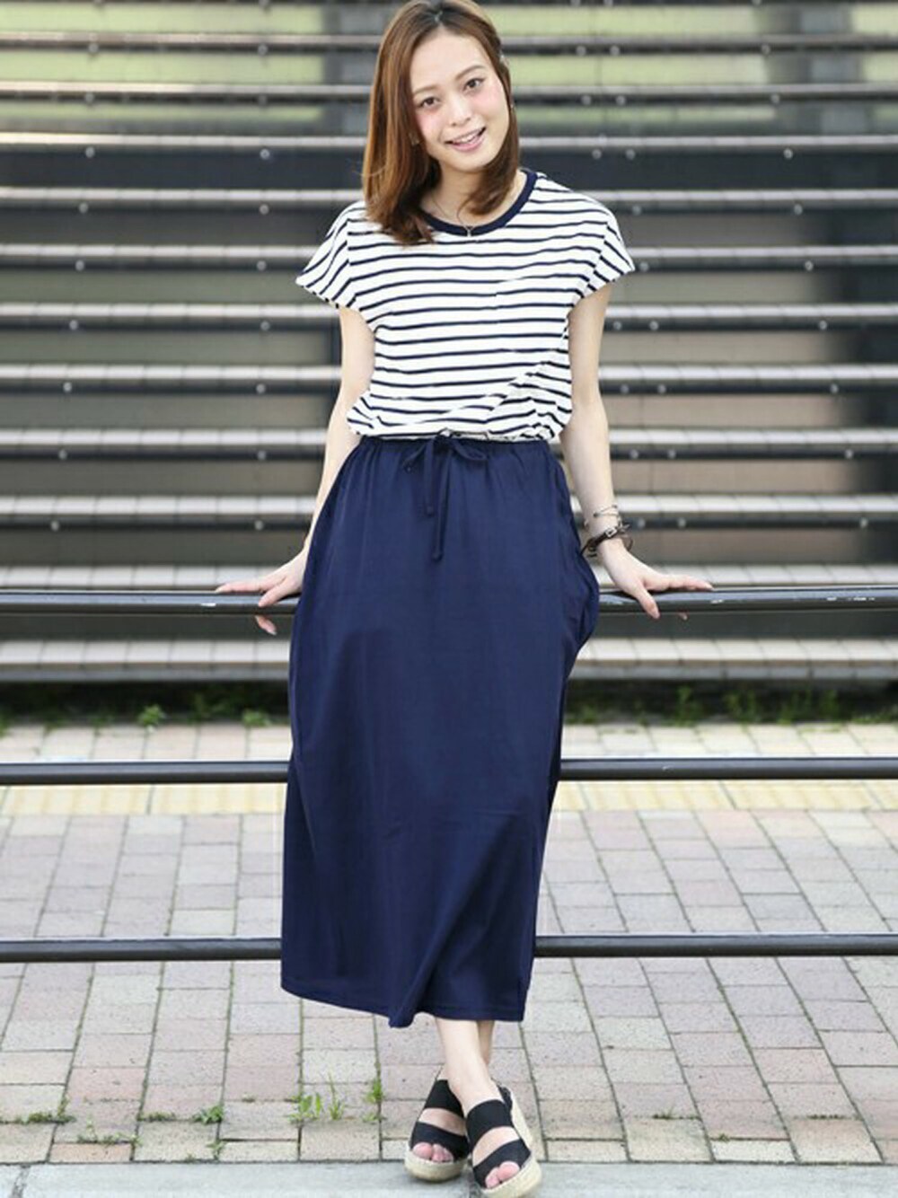 ブラウジングキリカエワンピ・ネイビー/FREE(5/22トピックス掲載商品) レザーブレスレット・ブラウン/FREE ストーンバングル・シルバー/FREE H162cm