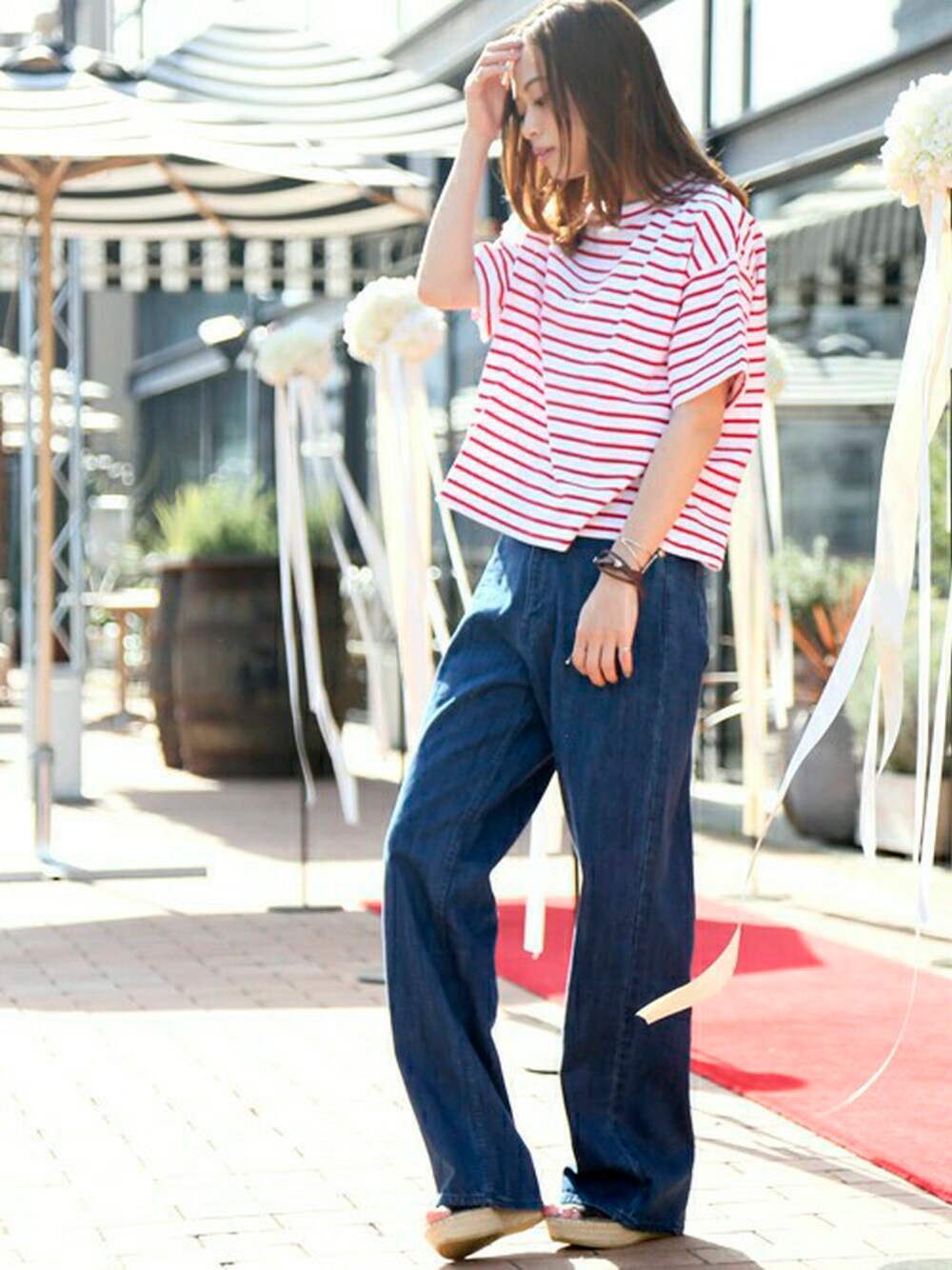ボーダーボトルネックトップス・レッド/FREE DENIM WIDE PANTS/デニムワイドパンツ・インディゴブルー/FREE(5/27トピックス掲載商品) レザーブレスレット・シルバー/FREE ストーンバングル・ブラウン/FREE H162cm