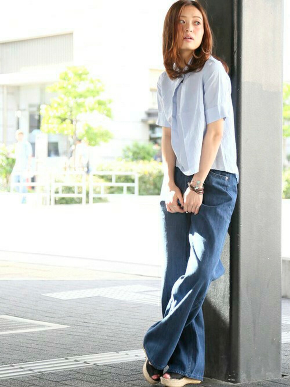 メンアサプルオーバーシャツ・サックスブルー/X-SMALL DENIM WIDE PANTS/デニムワイドパンツ・インディゴブルー/FREE(5/27トピックス掲載商品) レザーブレスレット・ブラウン/FREE ストーンバングル・シルバー/FREE H162cm