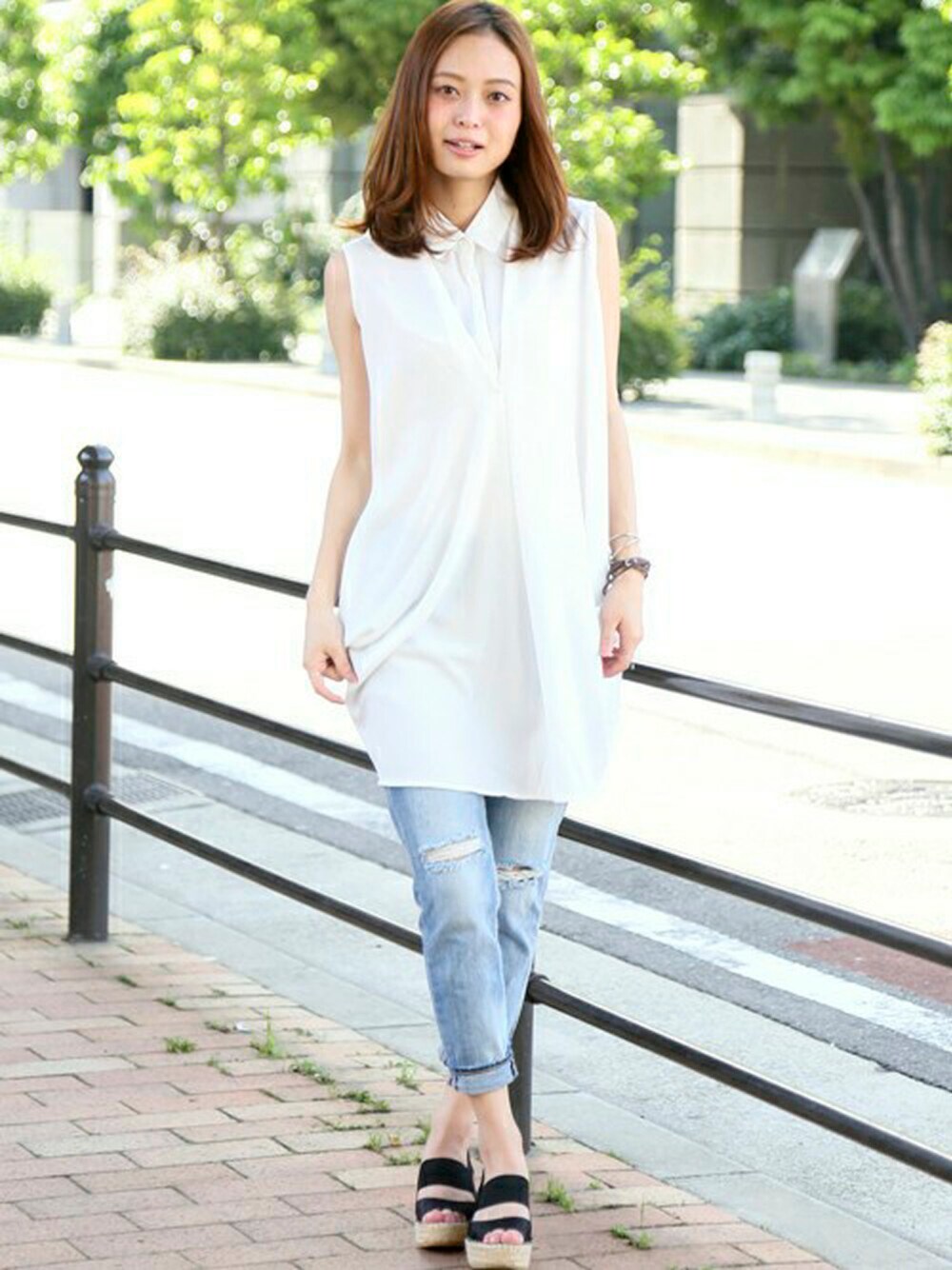 CHIFFON ONEPIECE/シフォンワンピース・オフホワイト/FREE ボーイズデニムパンツ・ライトインディゴブルー/X-SMALL(5/31トピックス掲載商品) レザーブレスレット・ブラウン/FREE ストーンバングル・シルバー/FREE H162cm