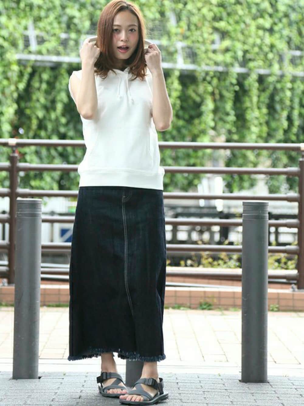 ウラケ ノースリーブ パーカー・ホワイト/FREE デニムマキシスカート・インディゴブルー/X-SMALL(6/6トピックス掲載商品) 【BONNARUE BONNARUE/ボナルーボナルー】BILLY L/スポーツサンダル ・グレー/SMALL H162cm