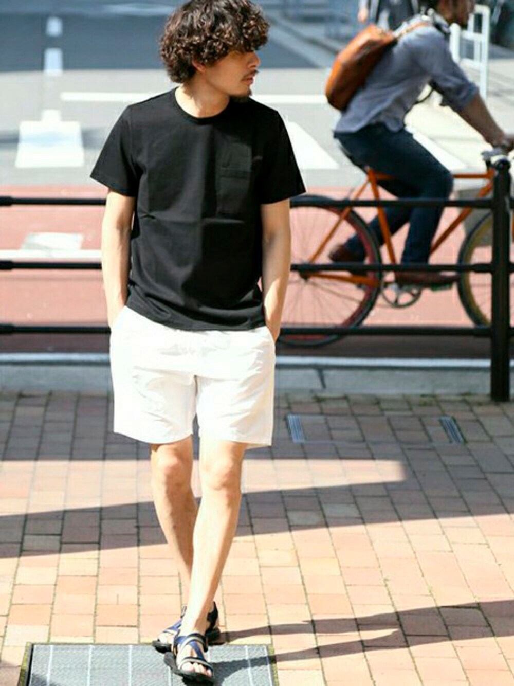【JapanMade】BASIC CUTSEW SS POCKET CN/ベーシックカットソーポケットTシャツ・ブラック/MEDIUM(6/9トピックス掲載商品) CN EASY SHORTS/コットンナイロンイージーショートパンツ・ホワイト/MEDIUM 【BONNARUE BONNARUE/ボナルーボナルー】BILLY M /スポーツサンダル ・ネイビー/MEDIUM H173 W73 58kg