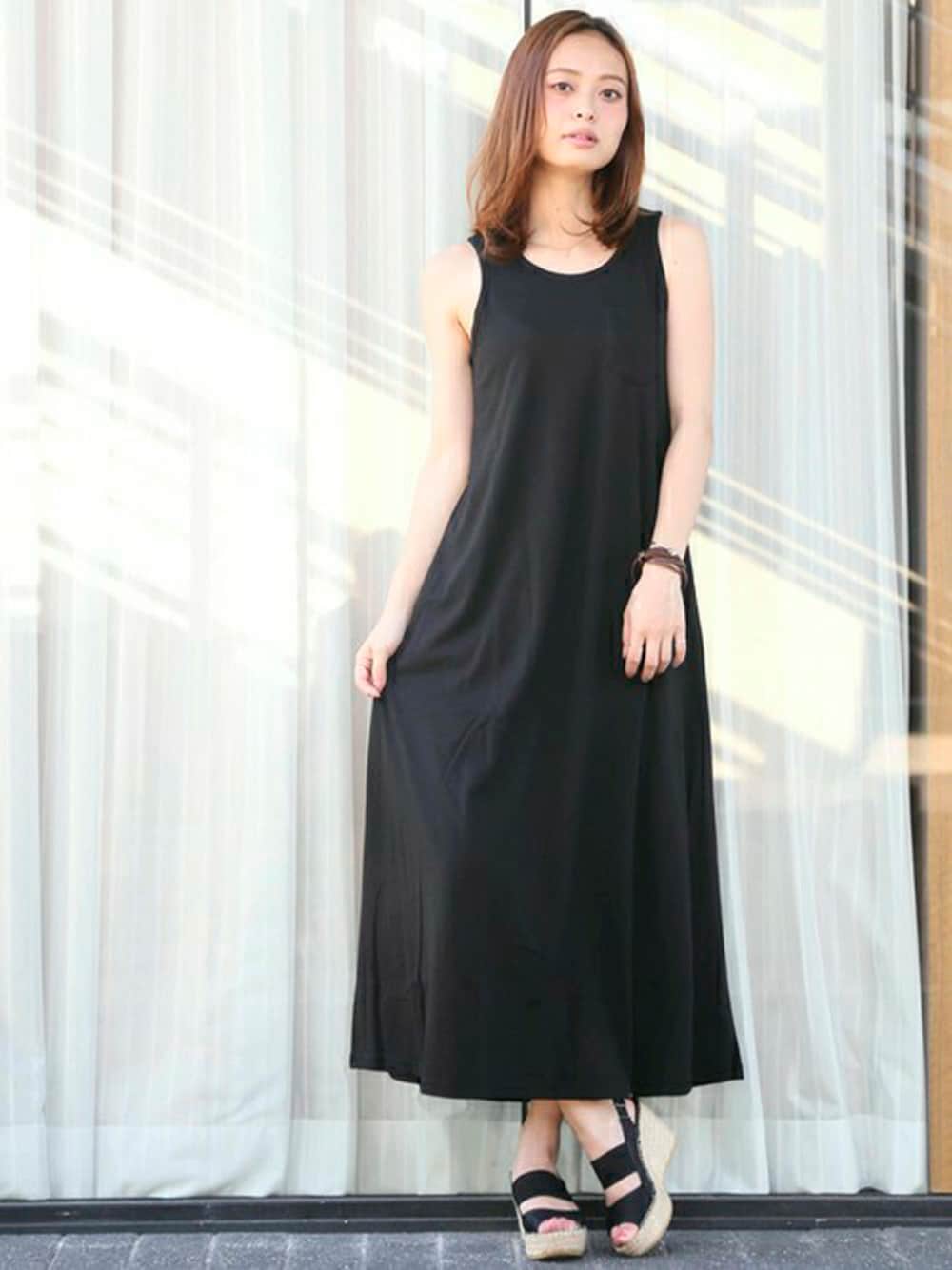 テンジクマキシワンピース・ブラック/FREE レザーブレスレット・ブラウン/FREE ストーンバングル・シルバー/FREE H162cm