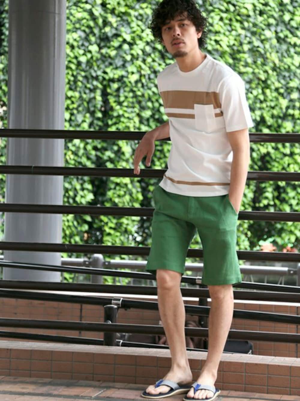 BORDER POCKET CREW TEE/ボーダーポケットクルーネックTEE・ベージュ系その他/MEDIUM リネンキャンバスショーツ/LINEN CANNVAS SP・グリーン/MEDIUM(7/6トピックス掲載商品) Denime×ISLAND SLIPPER”DENIM”・ネイビー/9 H173 W73 58kg