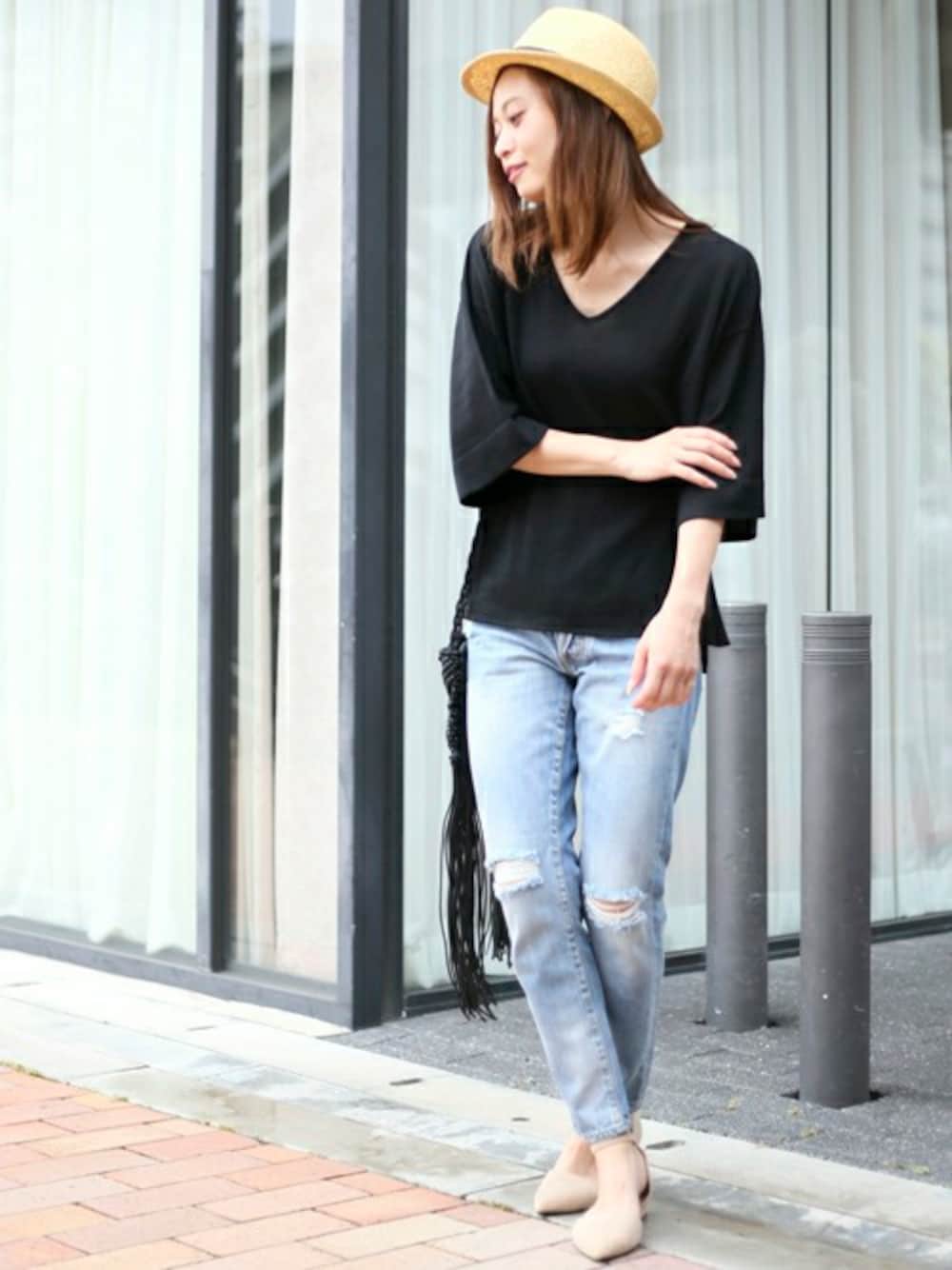 ペーパー中折れハット・ナチュラル/FREE 【WEB限定】Vネックサマーニット・ブラック/FREE(7/8トピックス掲載商品) ボーイズデニムパンツ・ライトインディゴブルー/X-SMALL フリンジショルダーバッグ・ブラック/FREE H162cm