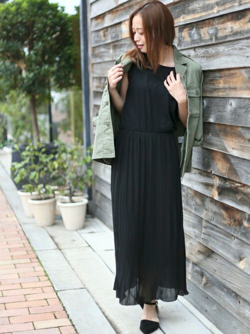 MILITARY JKT/ミリタリージャケット・カーキ/X-SMALL 【WEB限定】プリーツワンピース・ブラック/FREE(7/8トピックス掲載商品) H162cm