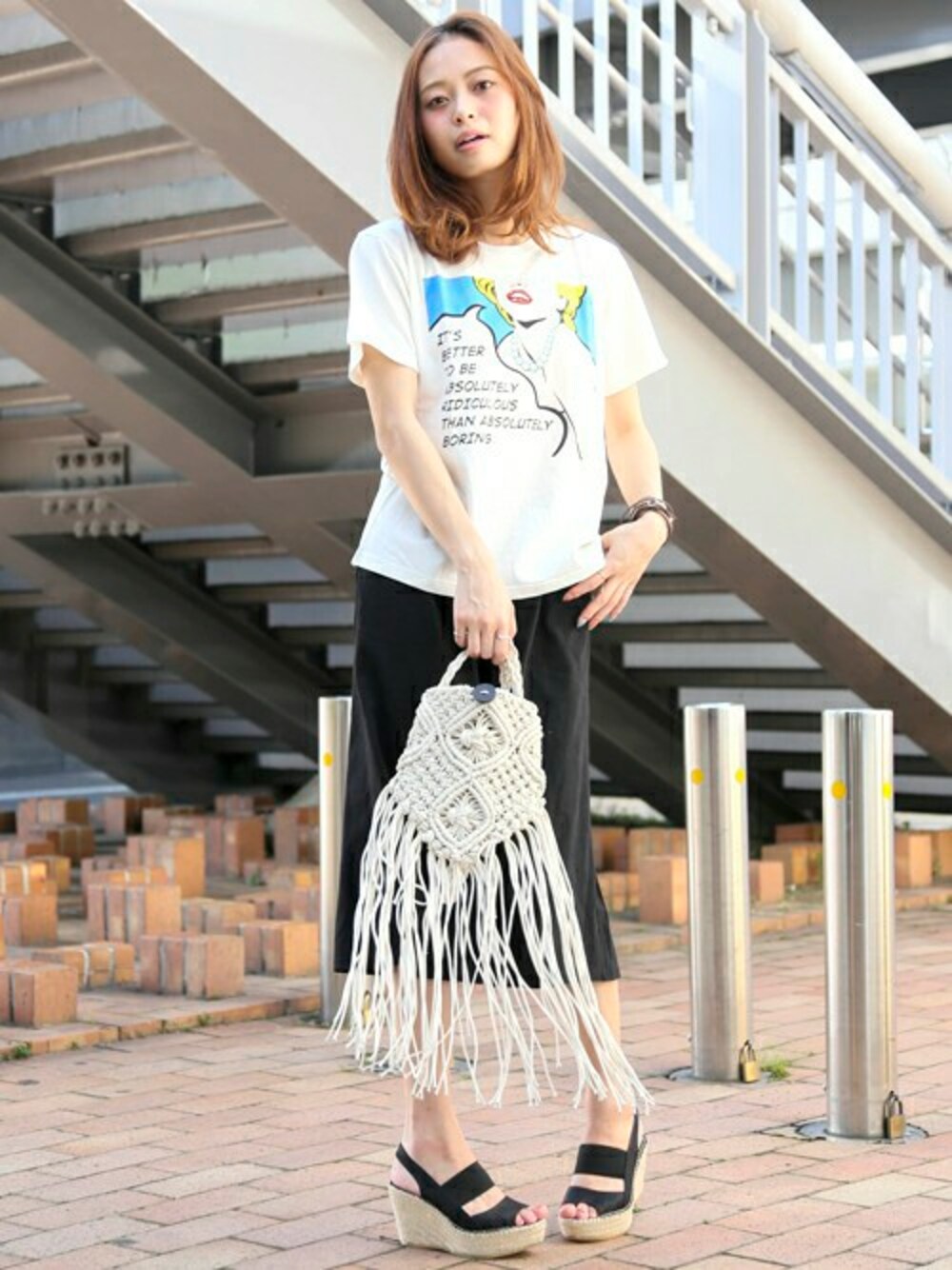【Marilyn Monroe/マリリンモンロー】Tシャツ:LADIES・ブルー/SMALL(7/12トピックス掲載商品) カットガウチョパンツ・ブラック/FREE フリンジショルダーバッグ・ホワイト/FREE レザーブレスレット・ブラウン/FREE ストーンバングル・シルバー/FREE H162cm