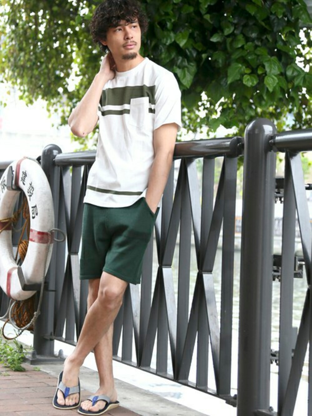 BORDER POCKET CREW TEE/ボーダーポケットクルーネックTEE・グリーン系その他/MEDIUM コットンリネンニットショーツ/CL RIB KNIT SHORT PT・グリーン/MEDIUM Denime×ISLAND SLIPPER”DENIM”・ネイビー/9(7/15トピックス掲載商品) H173 W73 58kg