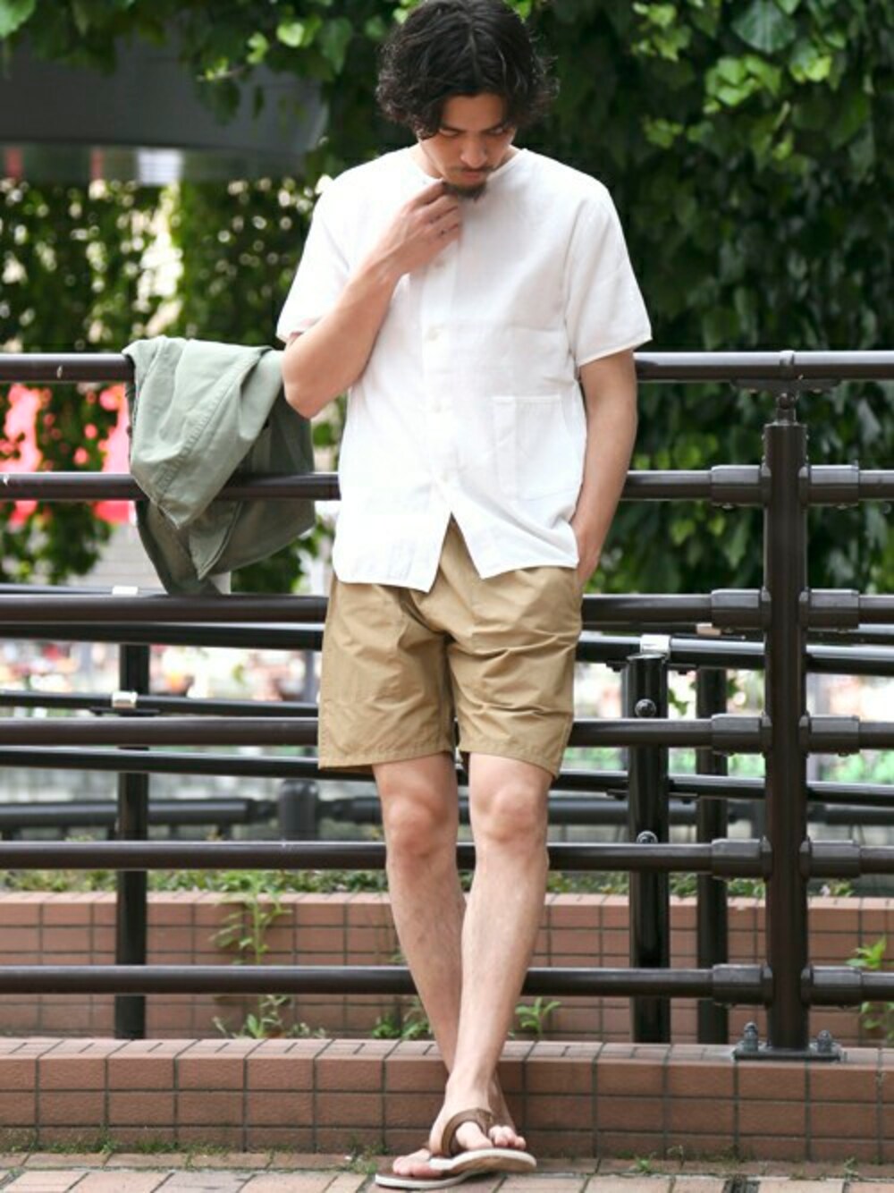 WAFFLE NOCOLLAR SH/ワッフルノーカラーシャツ・ホワイト/MEDIUM CN EASY SHORTS/コットンナイロンイージーショートパンツ・ベージュ/MEDIUM 【ISLAND SLIPPER/アイランドスリッパ】サンダル・ブラウン/9 TWILL WORK VEST/コットンツイルワークベスト・カーキ/MEDIUM H173 W73 58kg