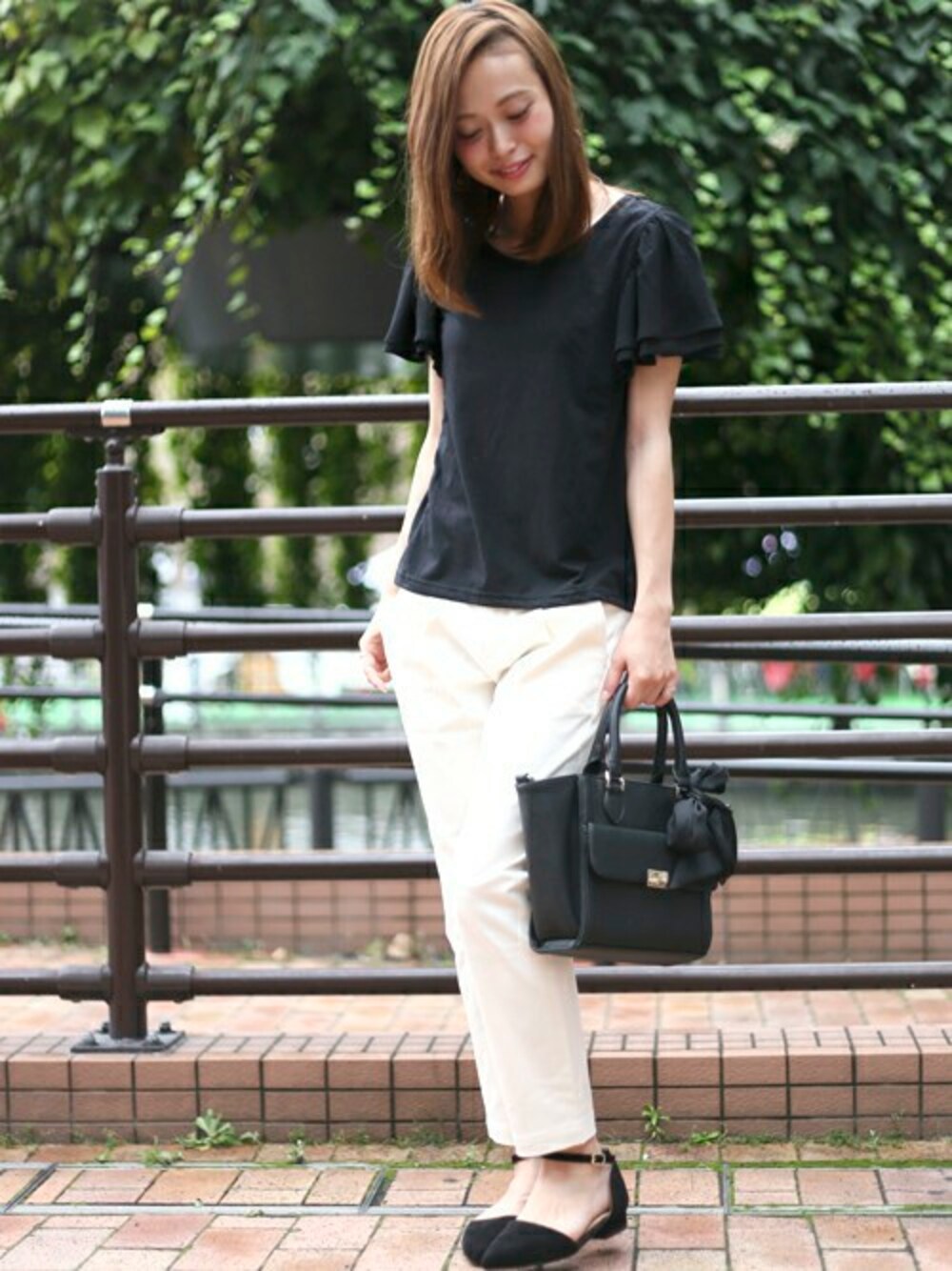 【WEB限定】フレアスリーブTシャツ・ブラック/FREE(7/23トピックス掲載商品) 【WEB限定】テーパードスリムチノパンツ・ホワイト/MEDIUM(7/23トピックス掲載商品) 【WEB限定】セパレートパンプス・ブラック/MEDIUM H162cm