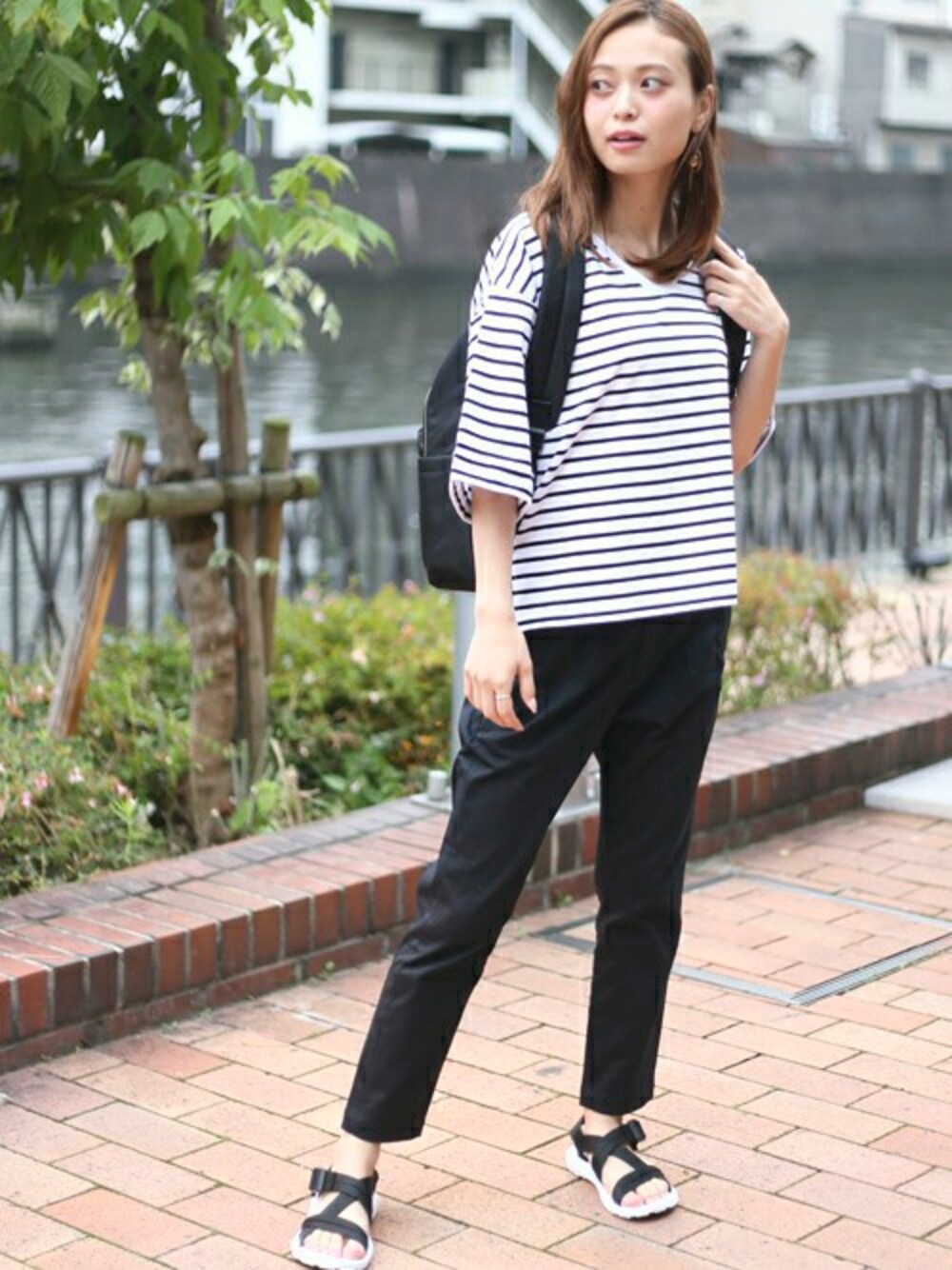 【WEB限定】VネックTシャツ・ホワイト×ブラック/FREE 【WEB限定】テーパードスリムチノパンツ・ブラック/MEDIUM(8/2トピックス掲載商品) 【WEB限定】ベーシックリュックサック・ブラック/FREE H162cm