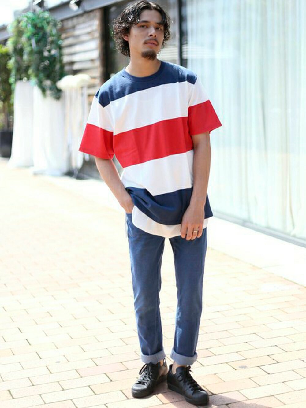 【WEB限定】USAコットンボーダーTシャツ・トリコロール/MEDIUM 【WEB限定】ワッフルロングタンクトップ・ホワイト/MEDIUM カットデニム 5ポケットパンツ・ブルー/MEDIUM 【adidas originals/アディダスオリジナルス】SUPERSTAR 80s TRIPLE/スーパースター ブラック・ブラック/9 H173 W73 58kg