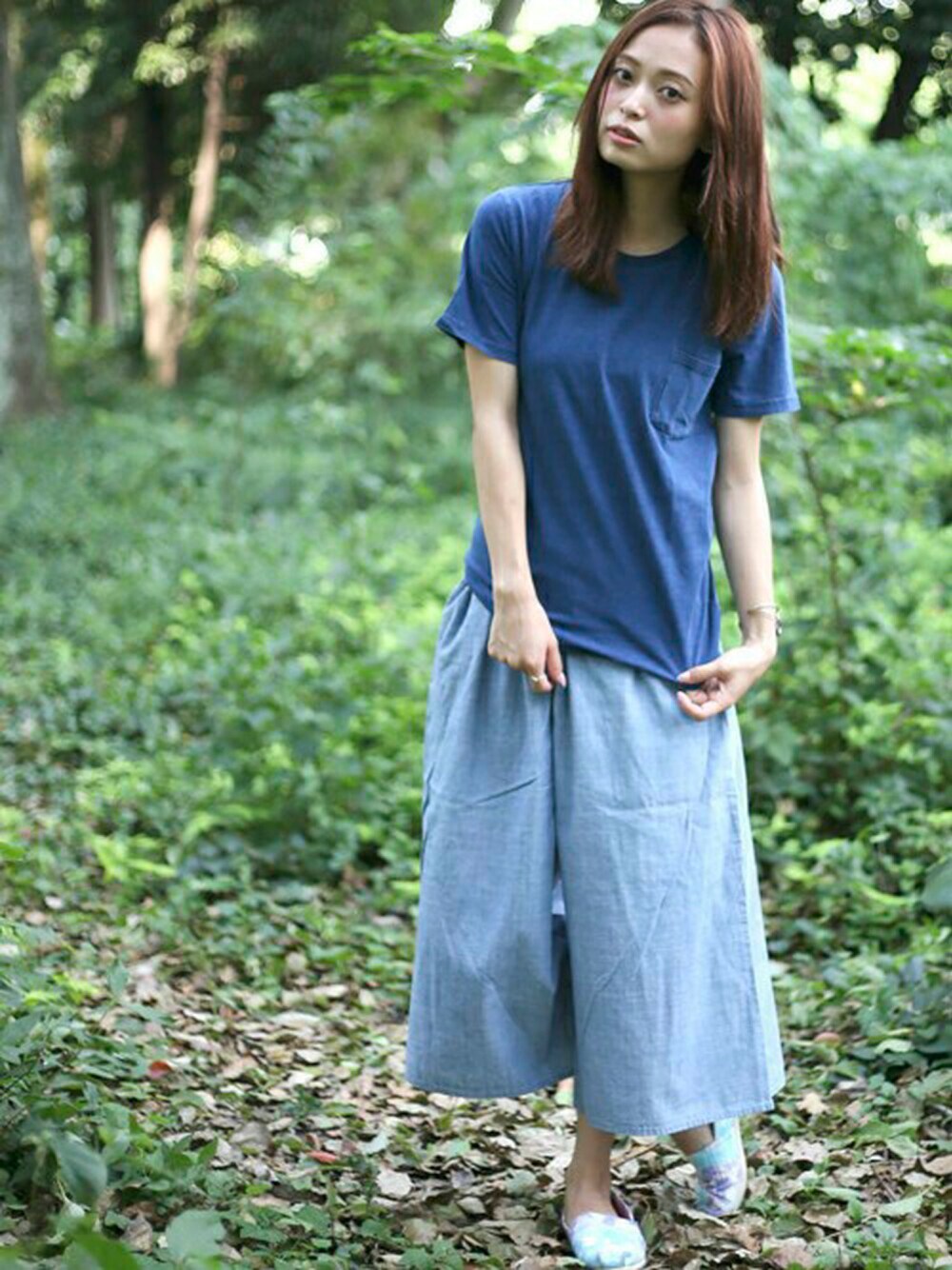 インディゴクルーネックポケT・インディゴブルー/X-SMALL シャンブレーガウチョパンツ・サックスブルー/FREE H162cm