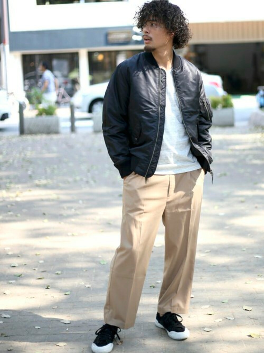 【16AW新作予約】STANDARD MA-1・ブラック/MEDIUM ダン染めVネックTシャツ・オートミール/MEDIUM(9/14トピックス掲載商品) TRワイドテーパードチノ・ベージュ/MEDIUM H173 W73 58kg