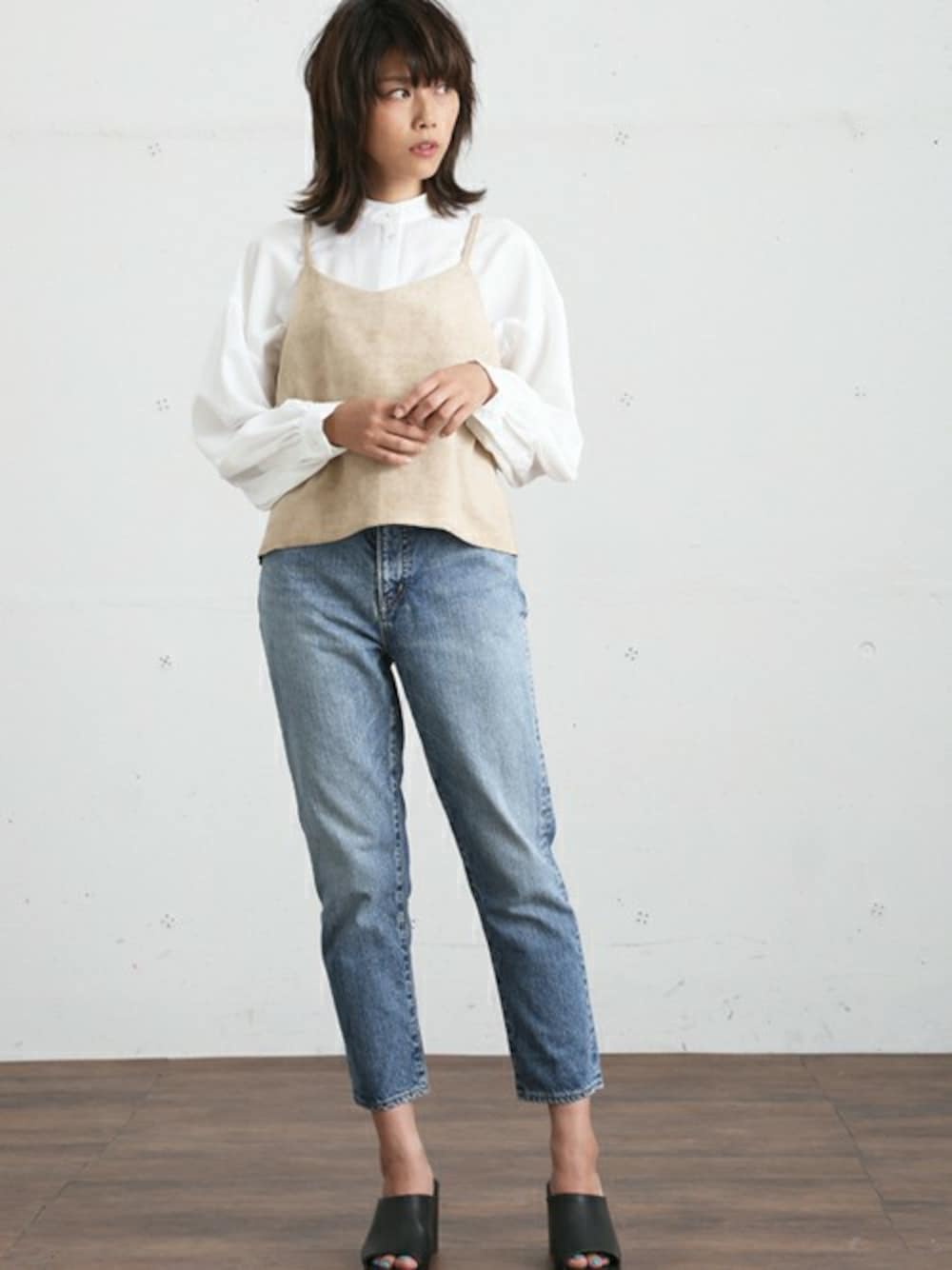 フェイクスウェードキャミソール・ベージュ/FREE ボリュームスリーブバンドカラーシャツ・ホワイト/FREE(9/25トピックス掲載商品) H164 B75 W58 H85